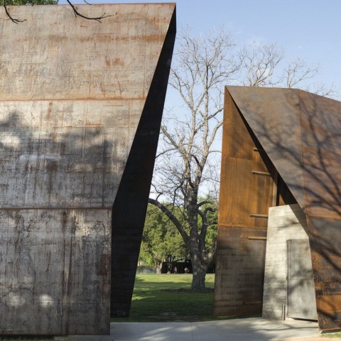 El resultado: dos edificios llamativos, escondidos cerca de un bosquecillo. Sin necesidad de acabados especiales o de mantenimiento, el proyecto está construido enteramente de acero y hormigón, dejados en bruto y sin terminar. El cambio de la luz del sol anima toda la experiencia; Amplifica los detalles y los bordes estrechos, resalta las formas facetadas, lanza rayos a través de espacios intencionados entre los materiales, además de crear sombra útil y patrones de sombra divertidos.