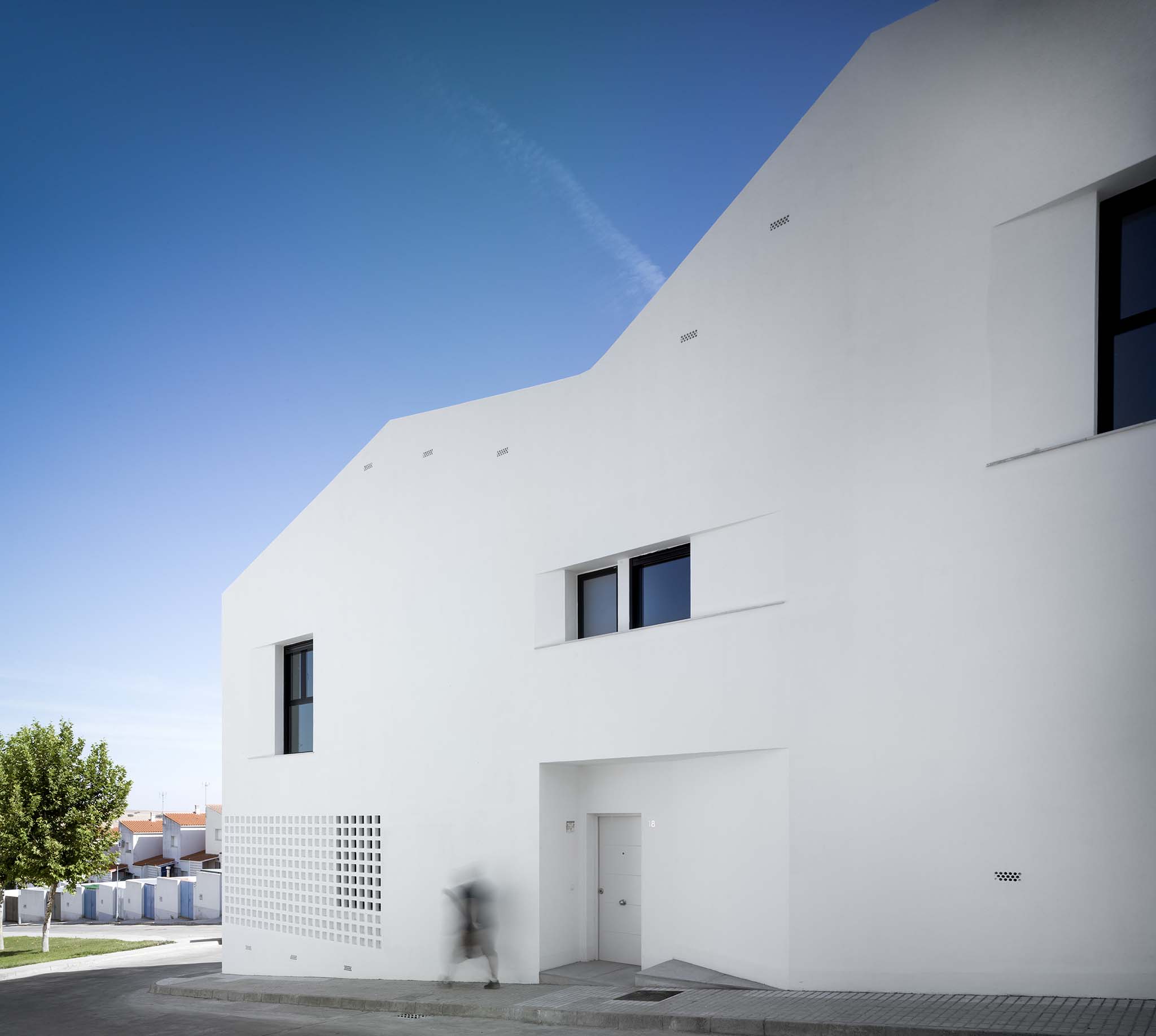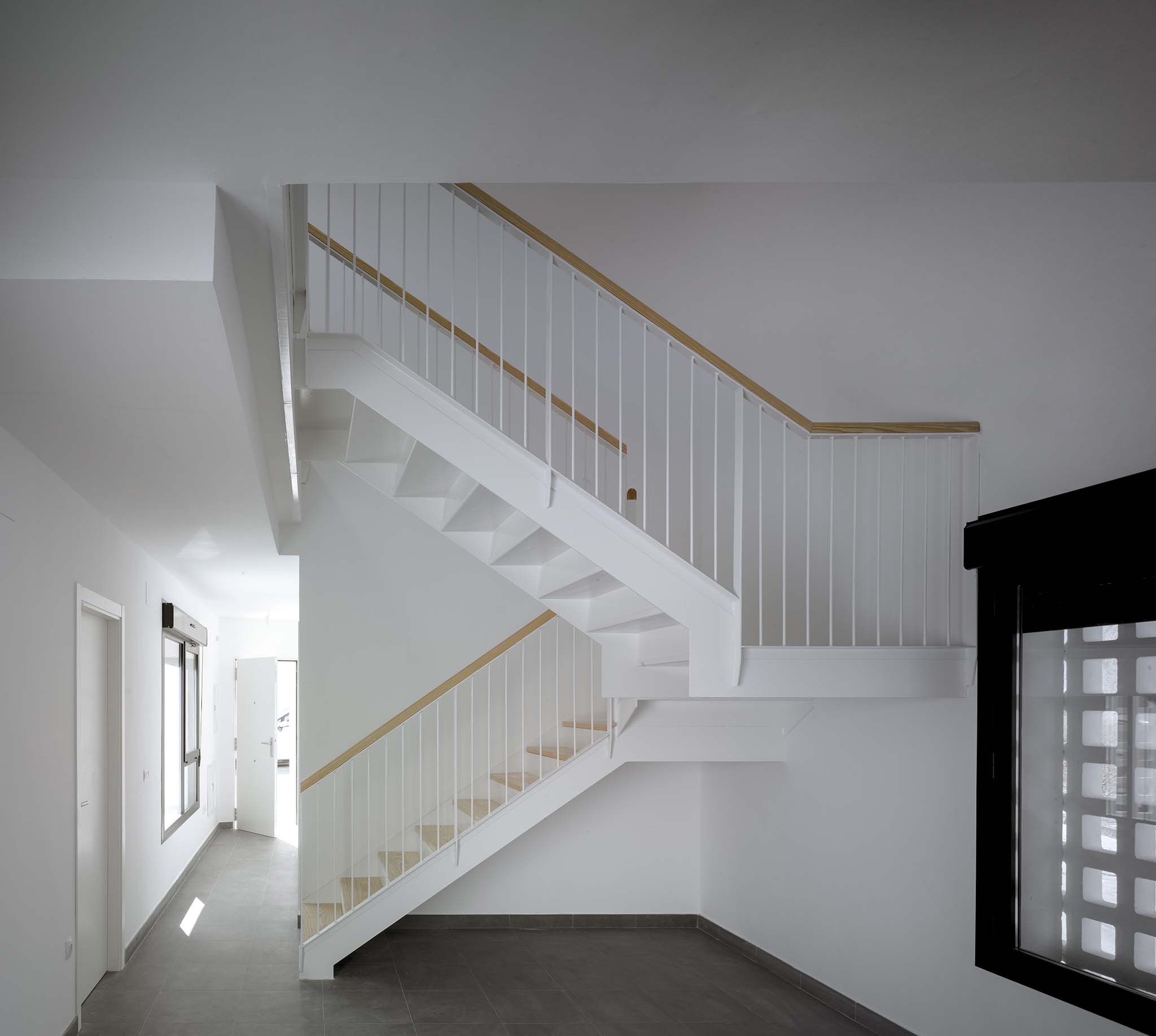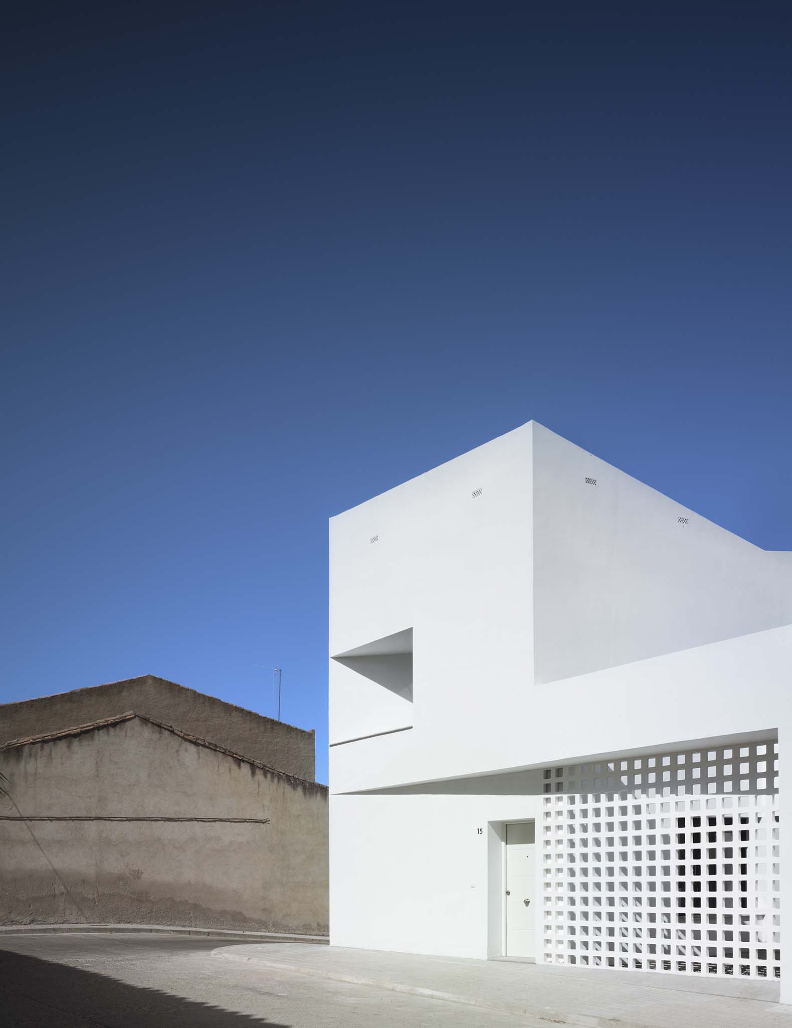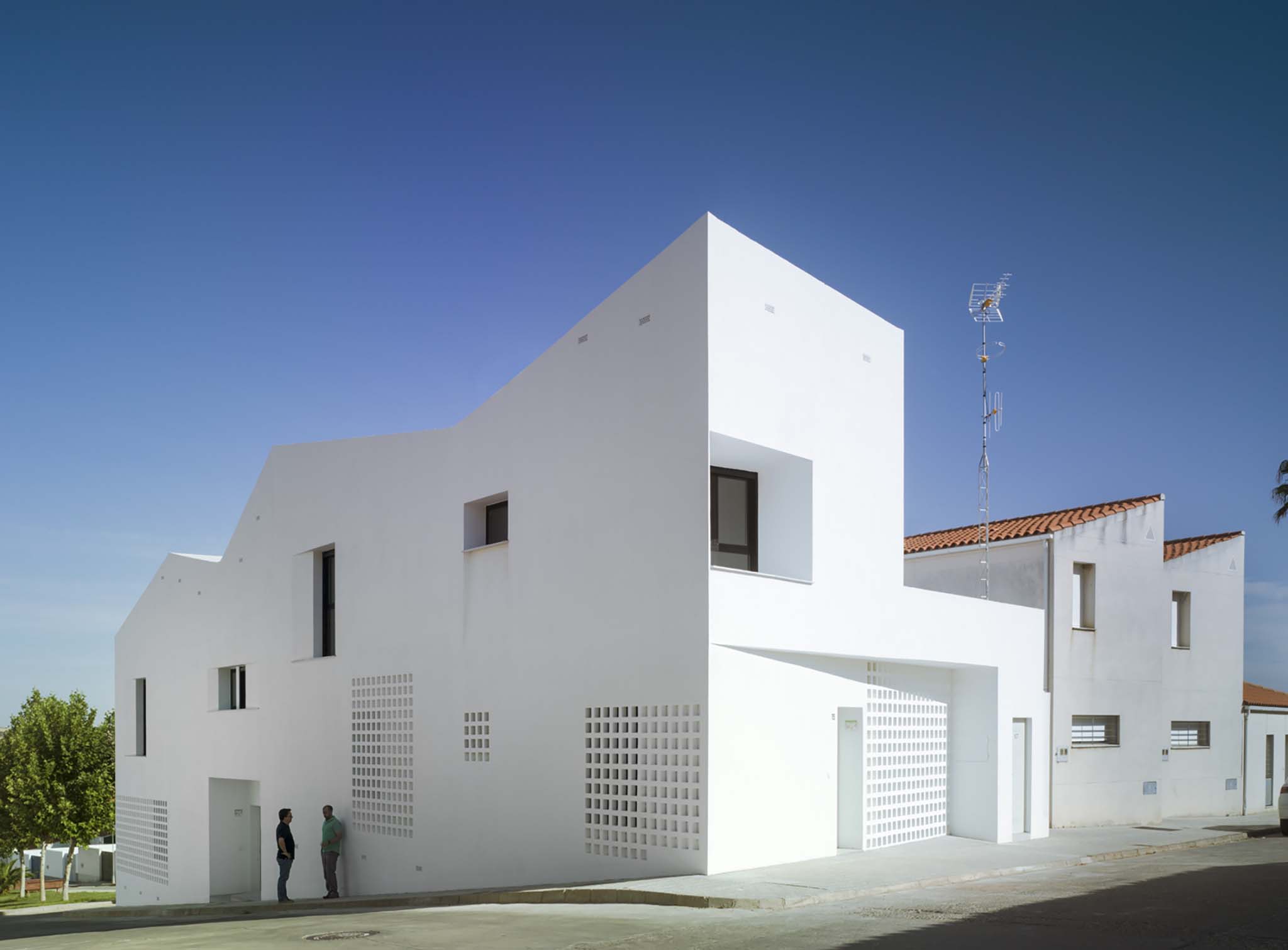 Las viviendas toman un valor paisajístico destacando entre sus adyacentes por su textura y color blanco pulido que invita a mirar hacia el interior a través de sus paños en celosía que unen el exterior hacia sus patios a través de la luz y la ventilación, pero sin dejar al margen la privacidad de sus estancias.
