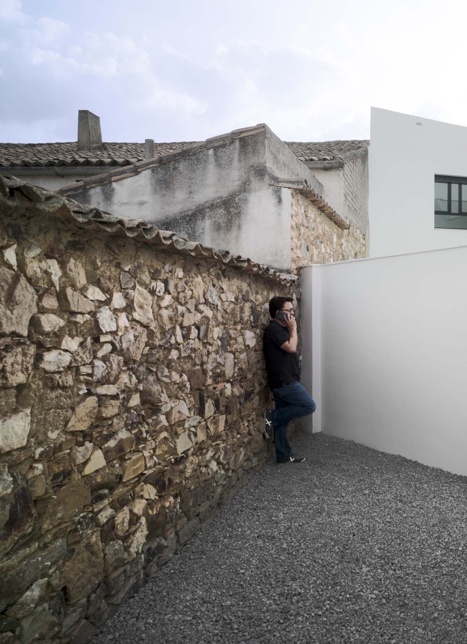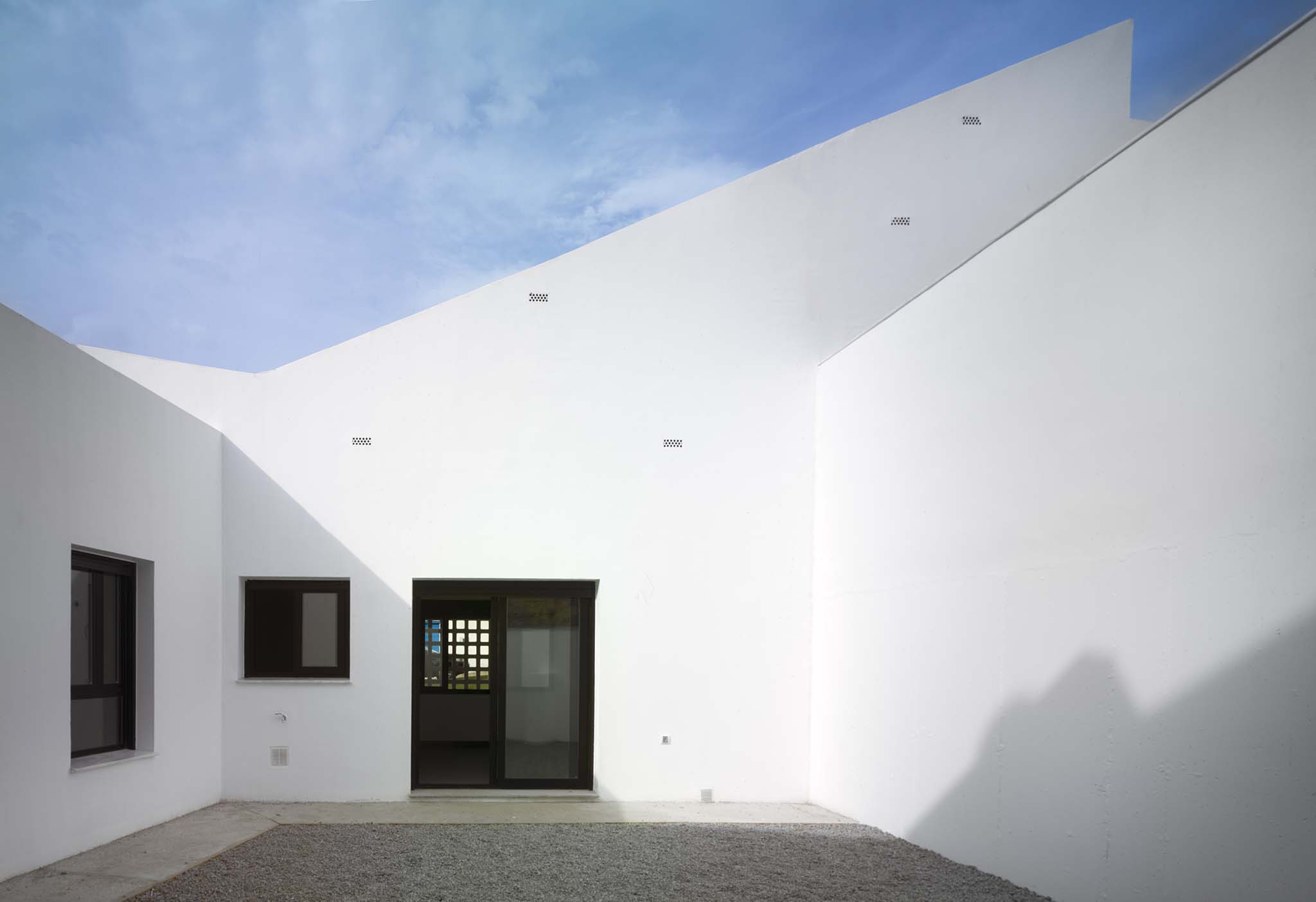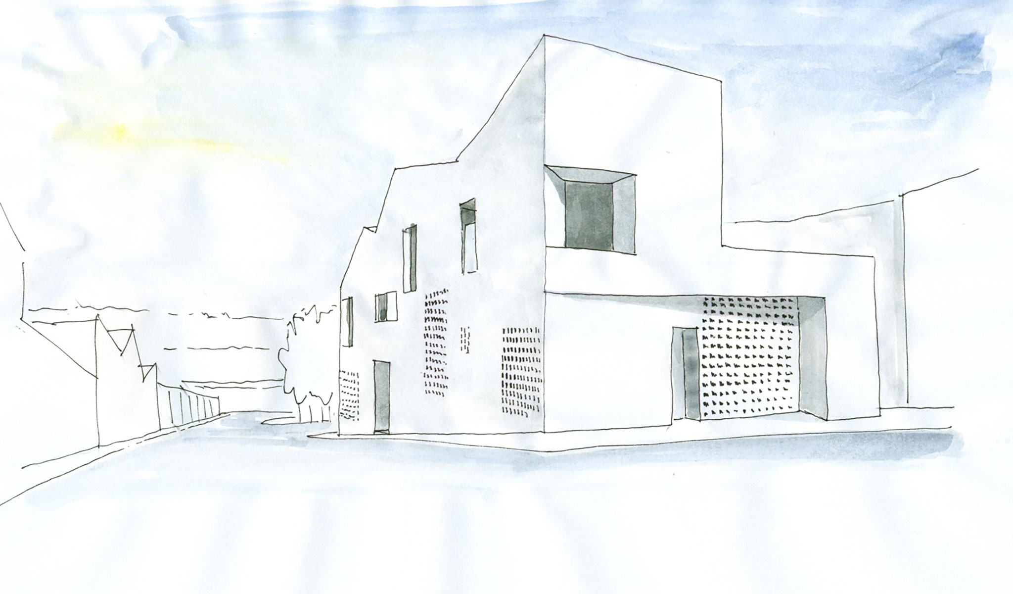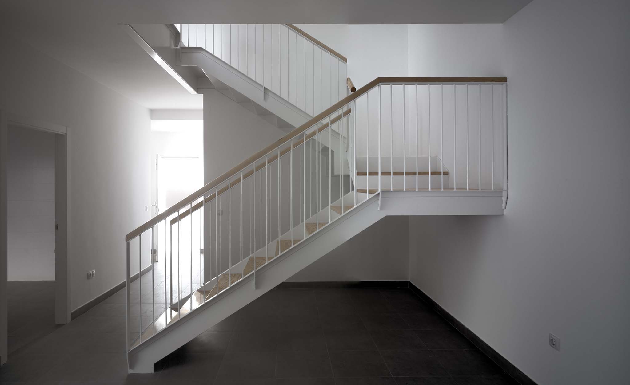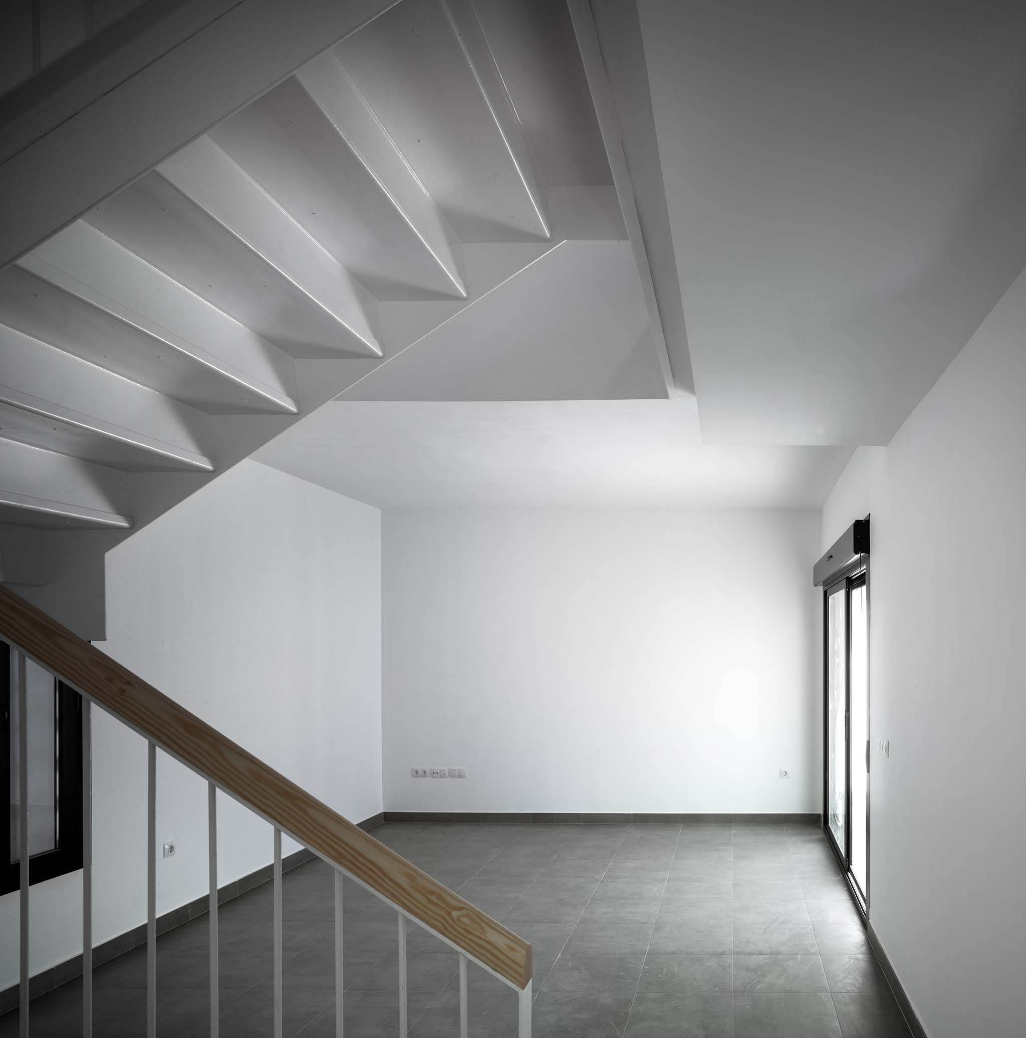 Las diferencias de cotas tan pronunciadas, nos originarían saltos relevantes entre las viviendas, por lo que se tuvo clara la intención de unificar y amortiguar estos “saltos” con una envolvente común del conjunto edificatorio, considerando este como único y no como una suma de varios elementos repetidos, tan común en las viviendas adosadas. Se pretendió que tanto las cubiertas inclinadas como las fachadas, actuaran como envolvente única, utilizando un mismo color para sus texturas (si hubiese que definir con un color mi recuerdo de las casas de los pueblos de Badajoz, es el blanco).