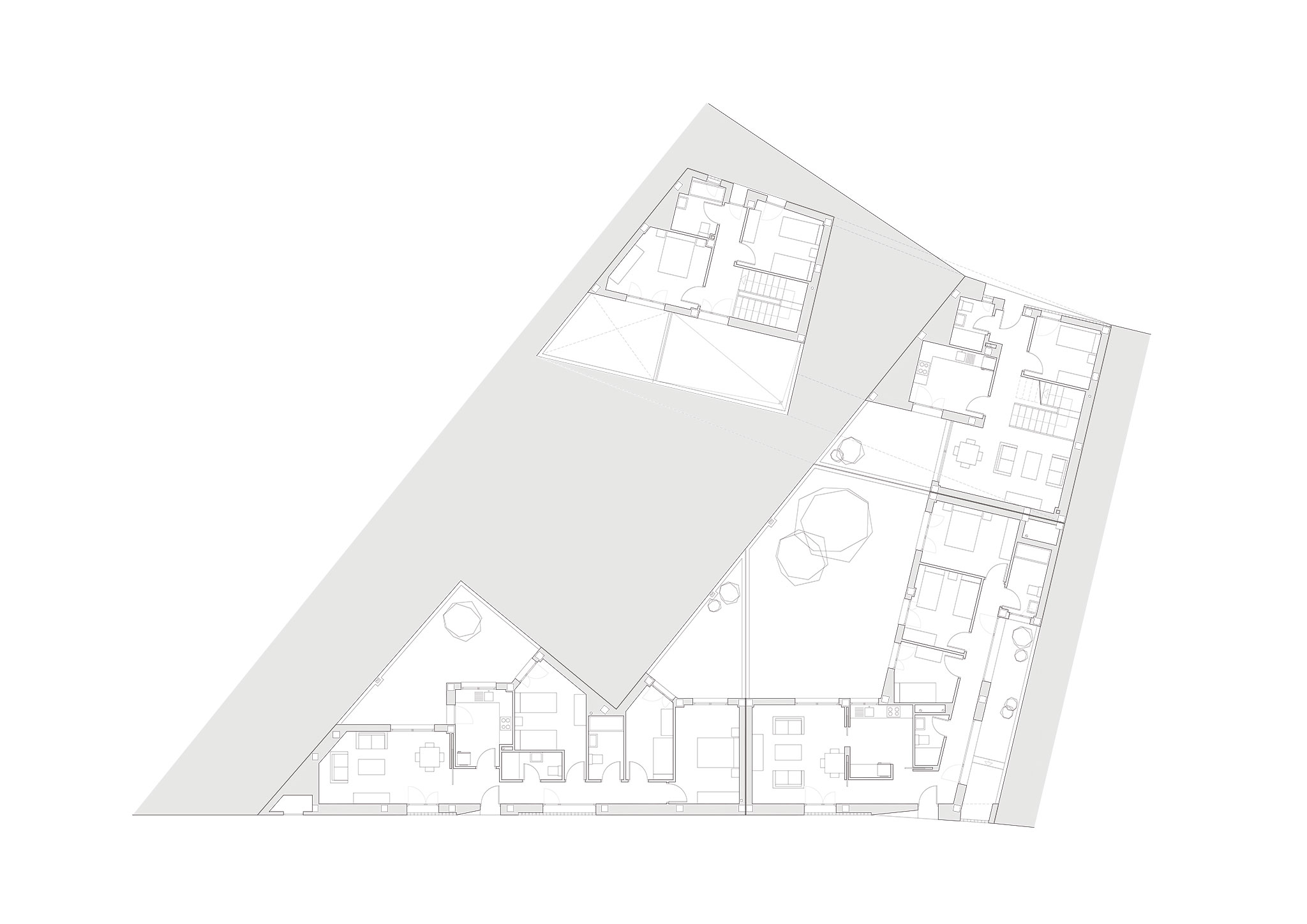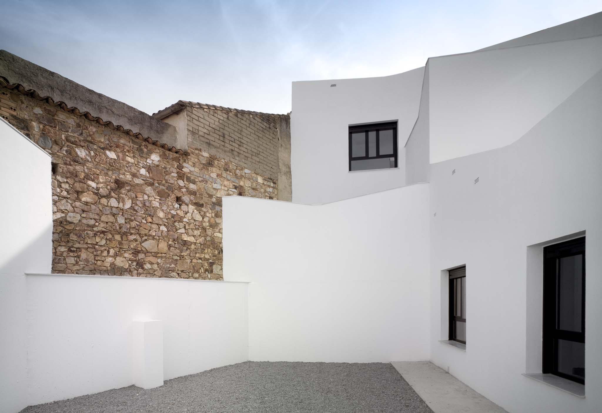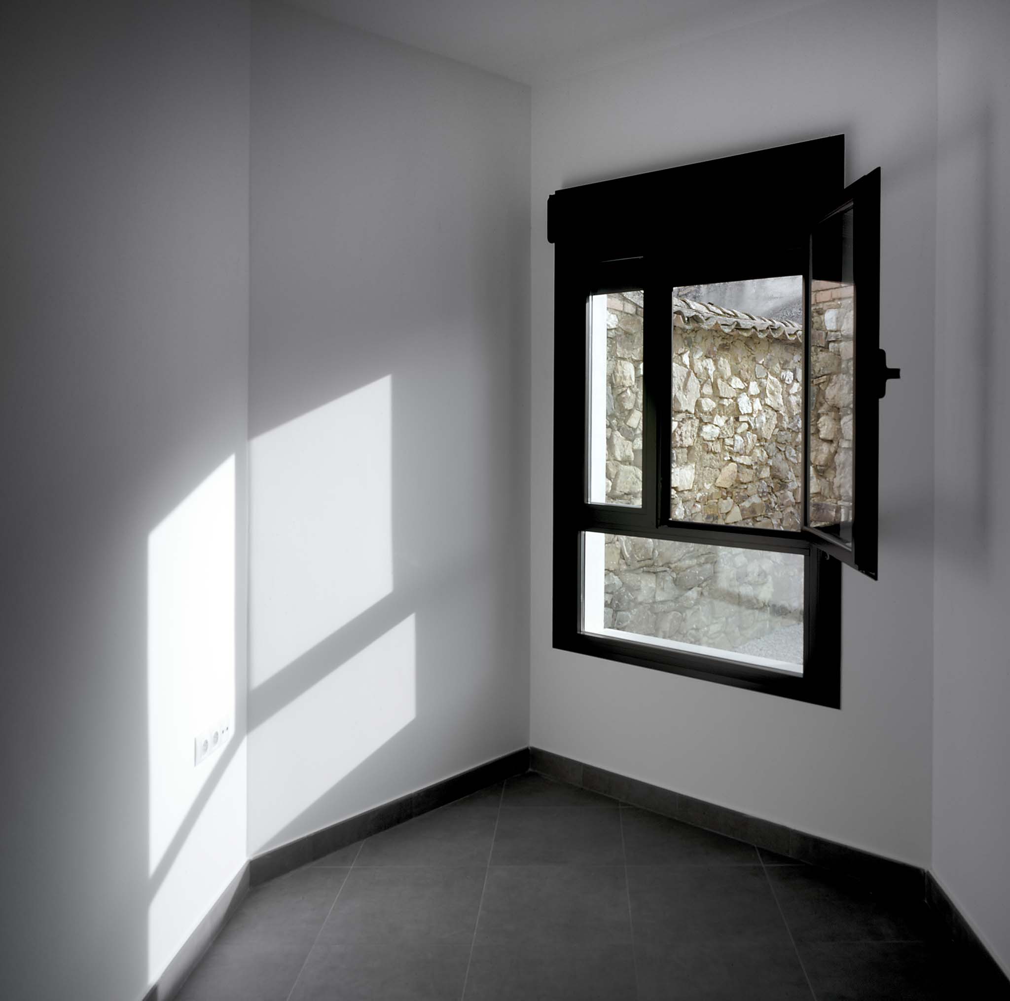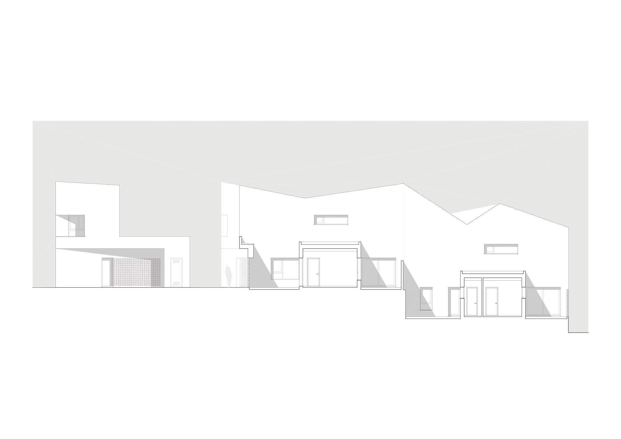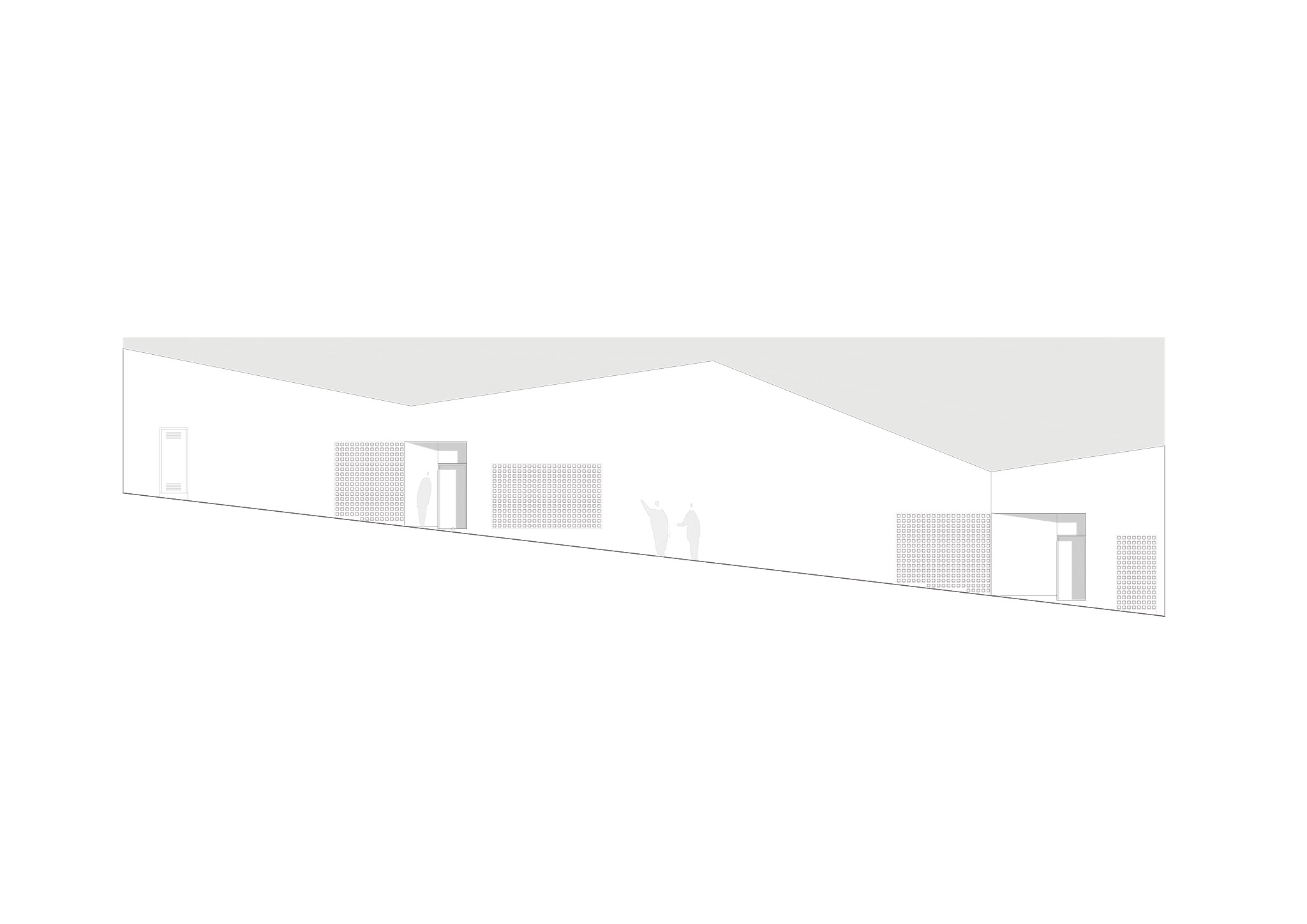 Las diferencias de cotas tan pronunciadas, nos originarían saltos relevantes entre las viviendas, por lo que se tuvo clara la intención de unificar y amortiguar estos “saltos” con una envolvente común del conjunto edificatorio, considerando este como único y no como una suma de varios elementos repetidos, tan común en las viviendas adosadas. Se pretendió que tanto las cubiertas inclinadas como las fachadas, actuaran como envolvente única, utilizando un mismo color para sus texturas (si hubiese que definir con un color mi recuerdo de las casas de los pueblos de Badajoz, es el blanco).