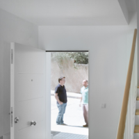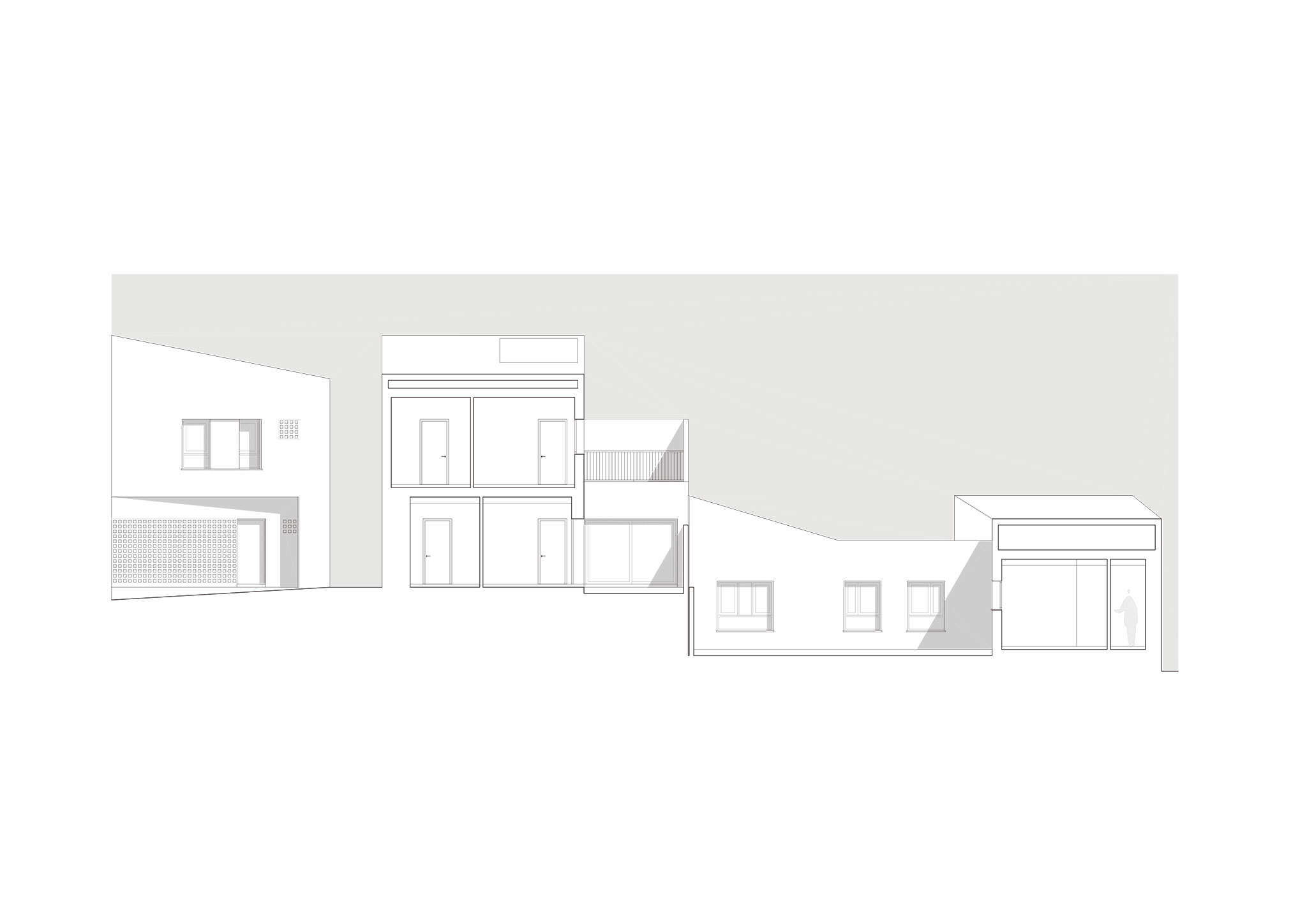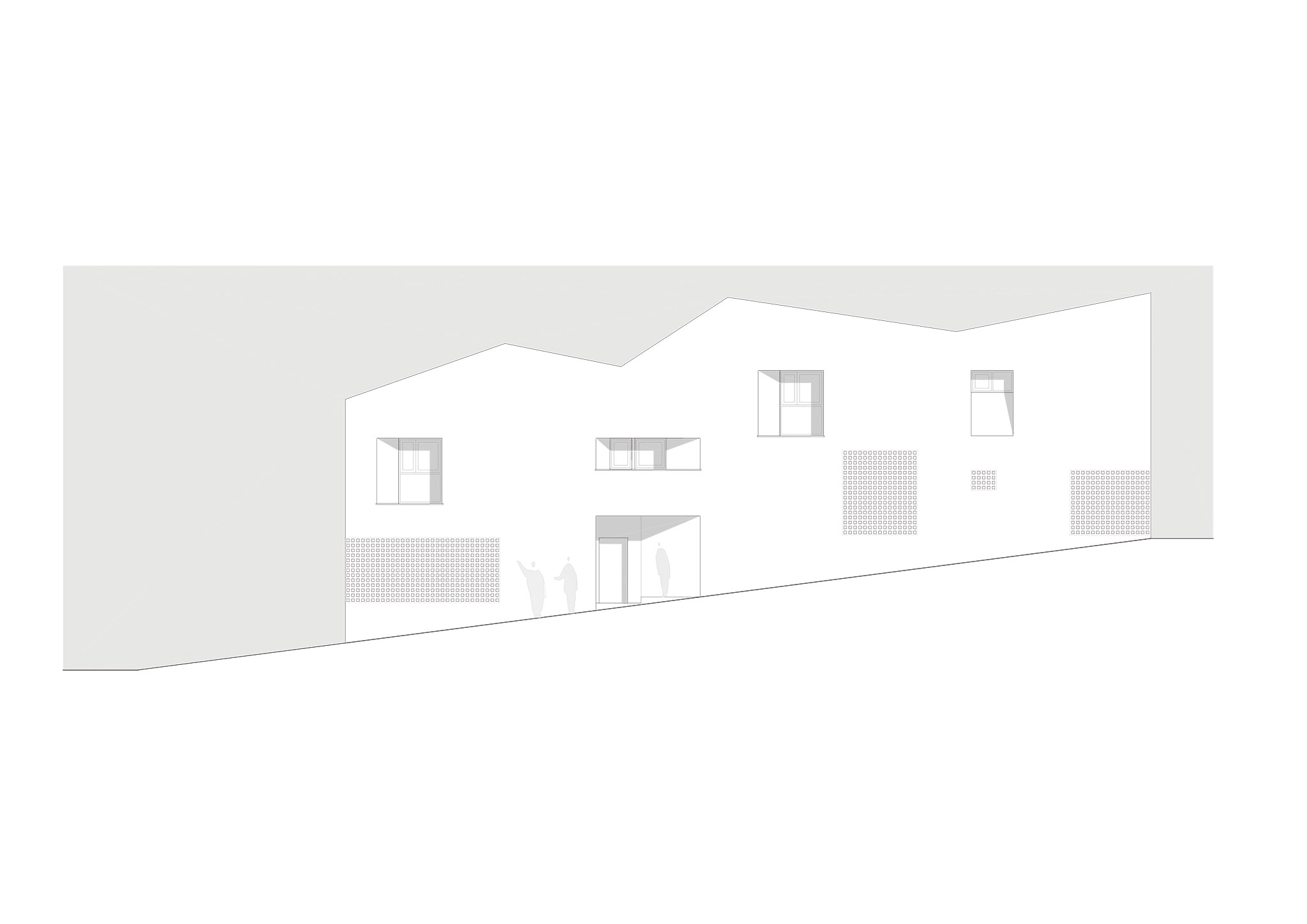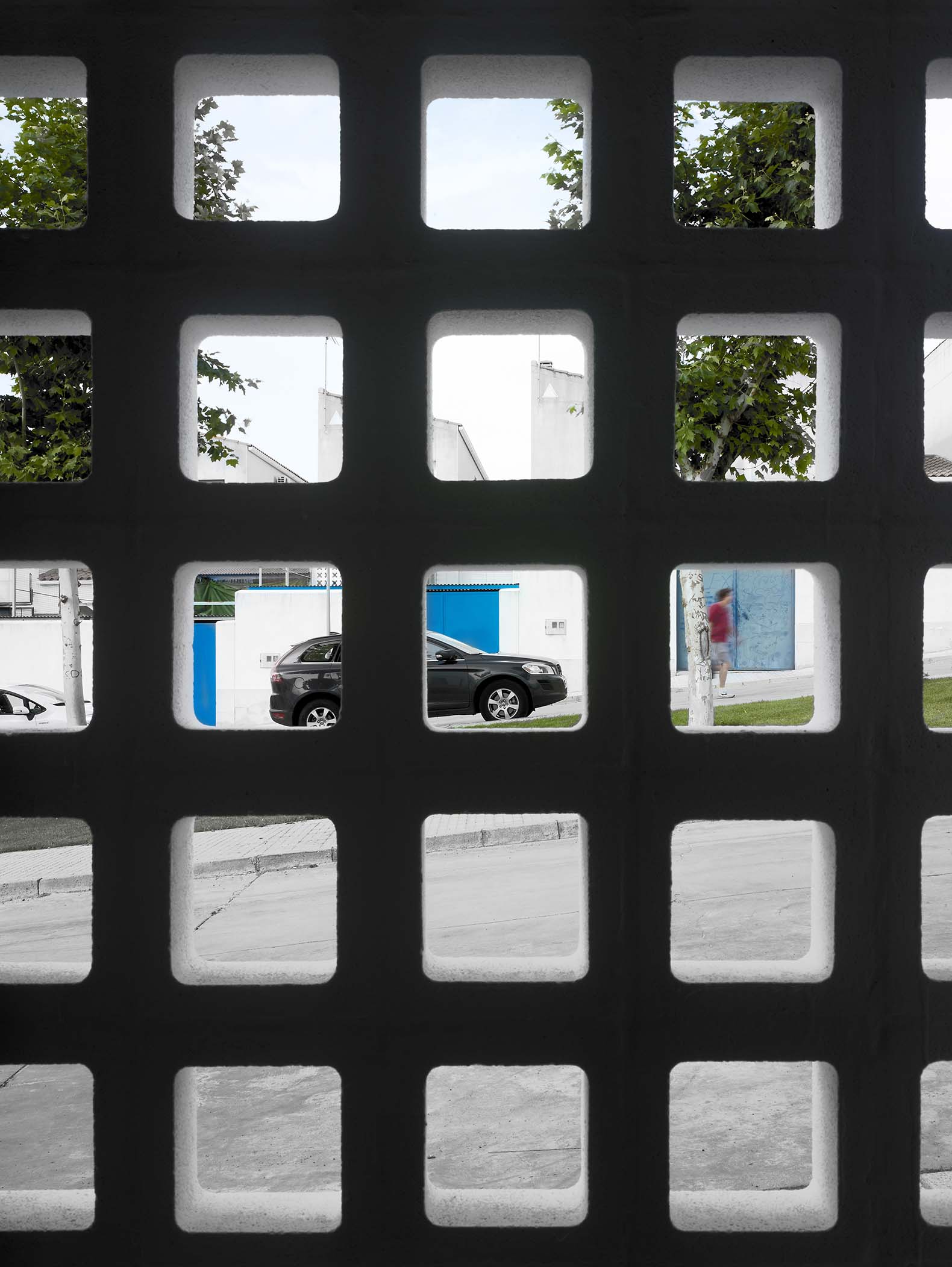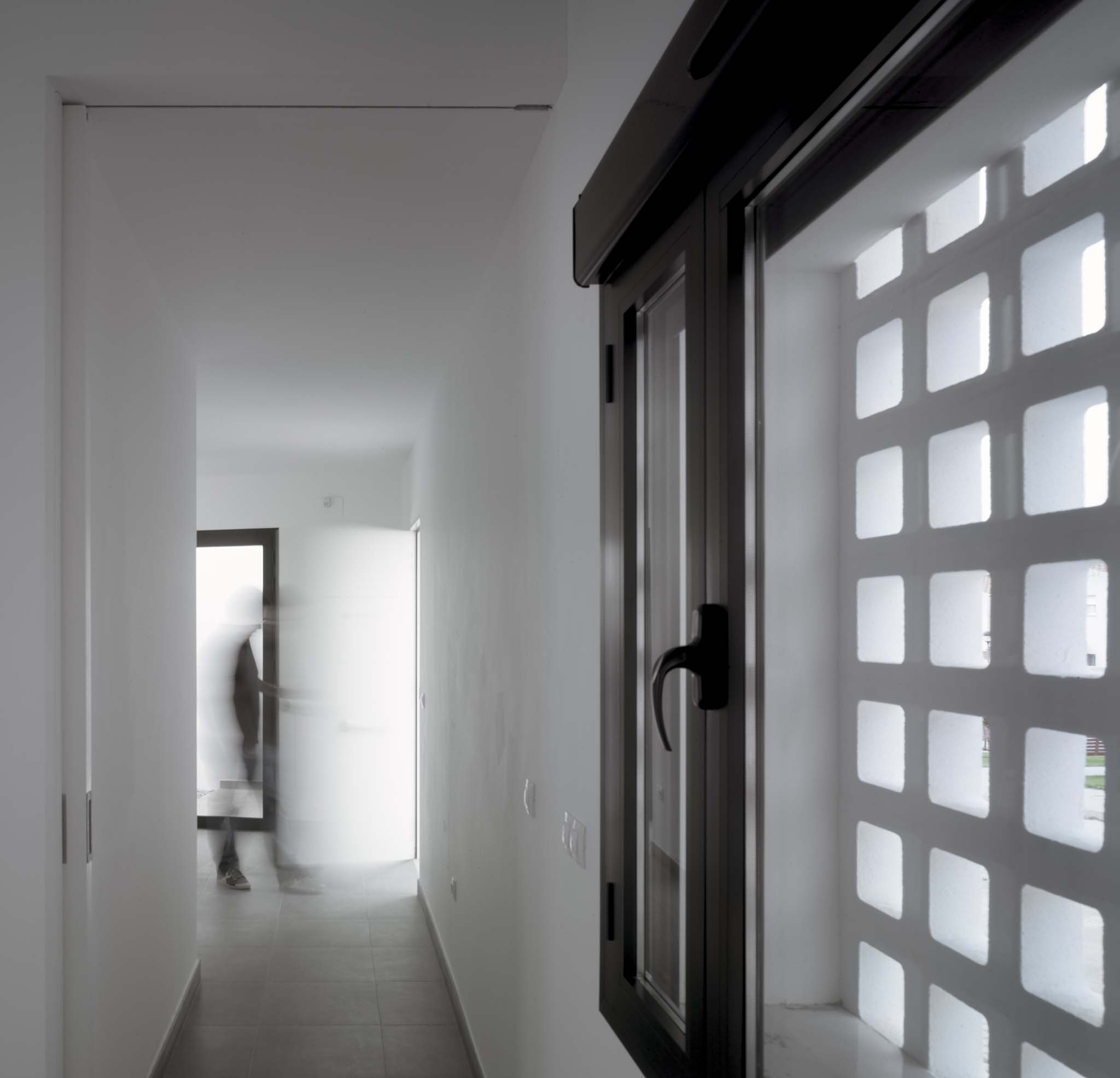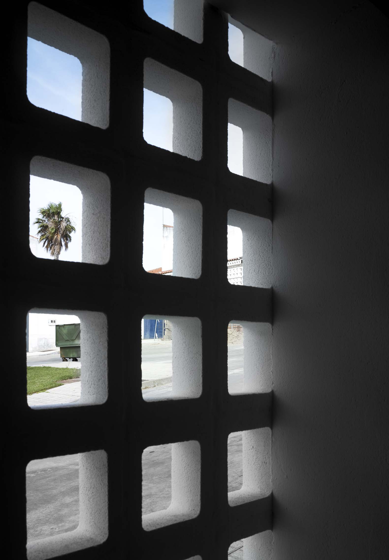 Con el fin de obtener, por un lado, la privacidad de las estancias de planta baja y por otro, dar mayor relevancia y rotundidad a la textura blanca, se concibe una sucesión de paños de celosías integradas en el cerramiento tras las que se ocultan diferentes aberturas.