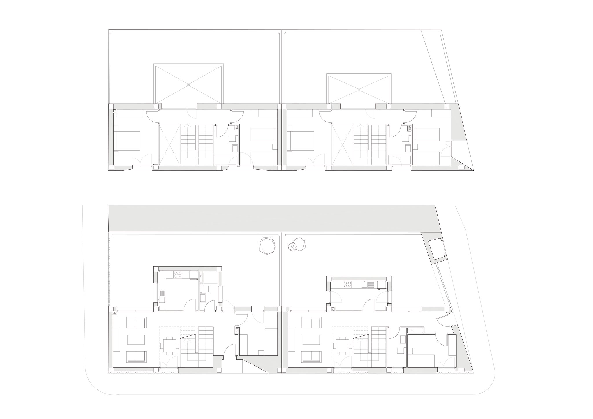 La peculiaridad de tener dos solares con alineaciones cada uno de ellos a diferentes calles, nos propicia tener diferentes perspectivas de las edificaciones e integrarlas en las diferentes escenografías urbanas de las que forman parte, conservando en todo el proyecto un lenguaje compositivo común.