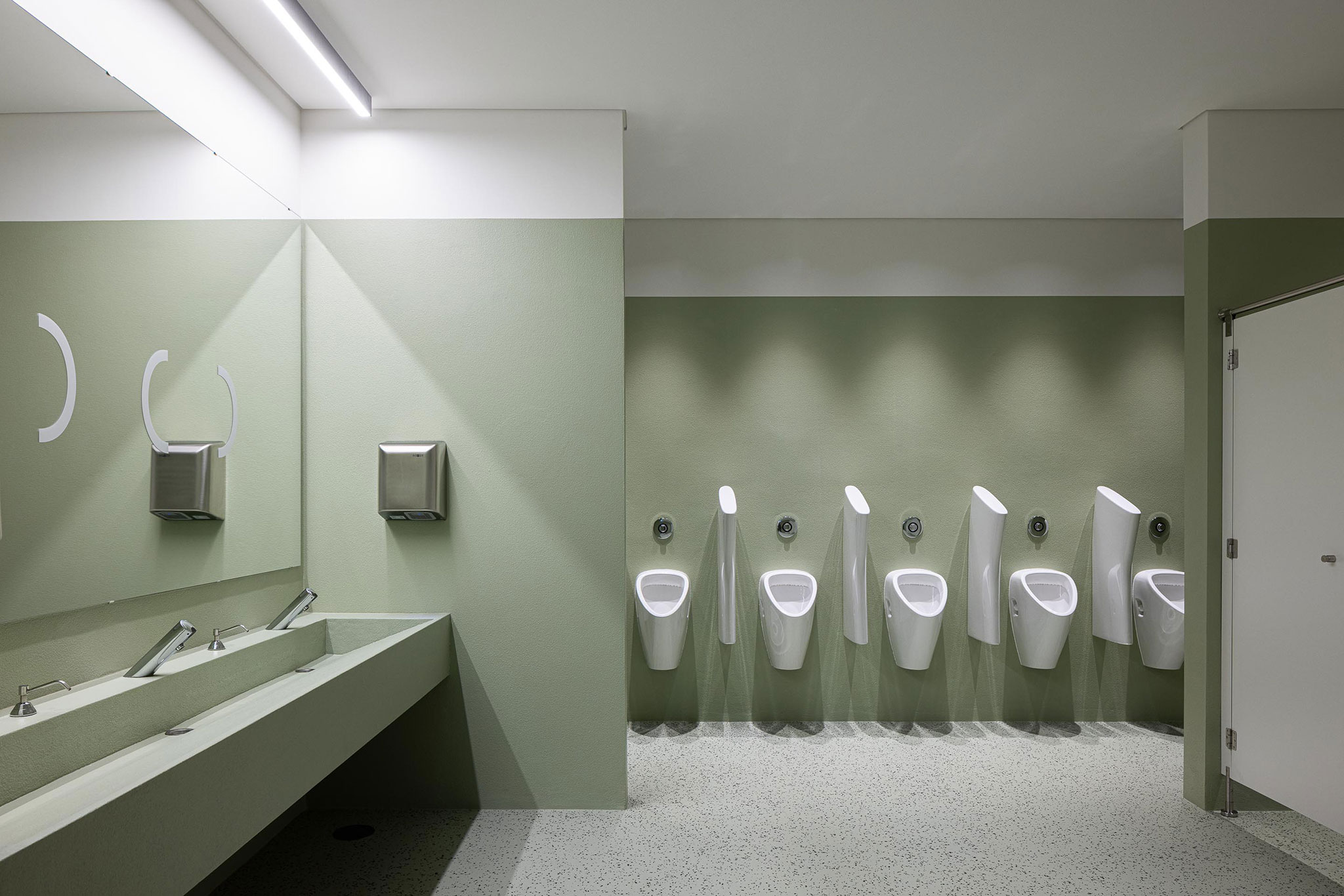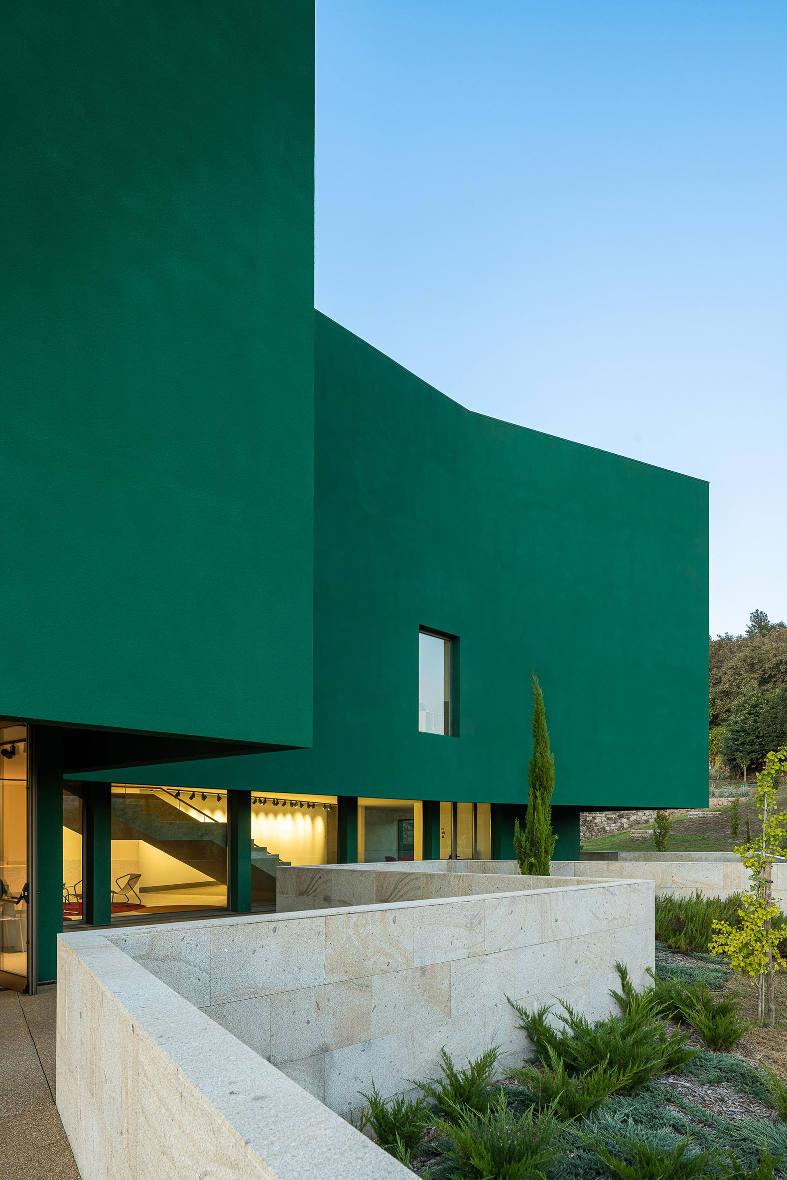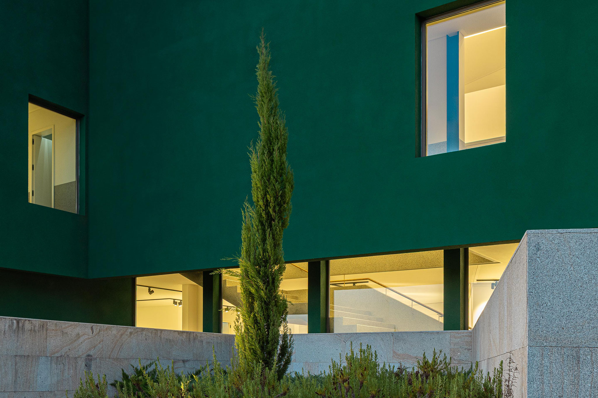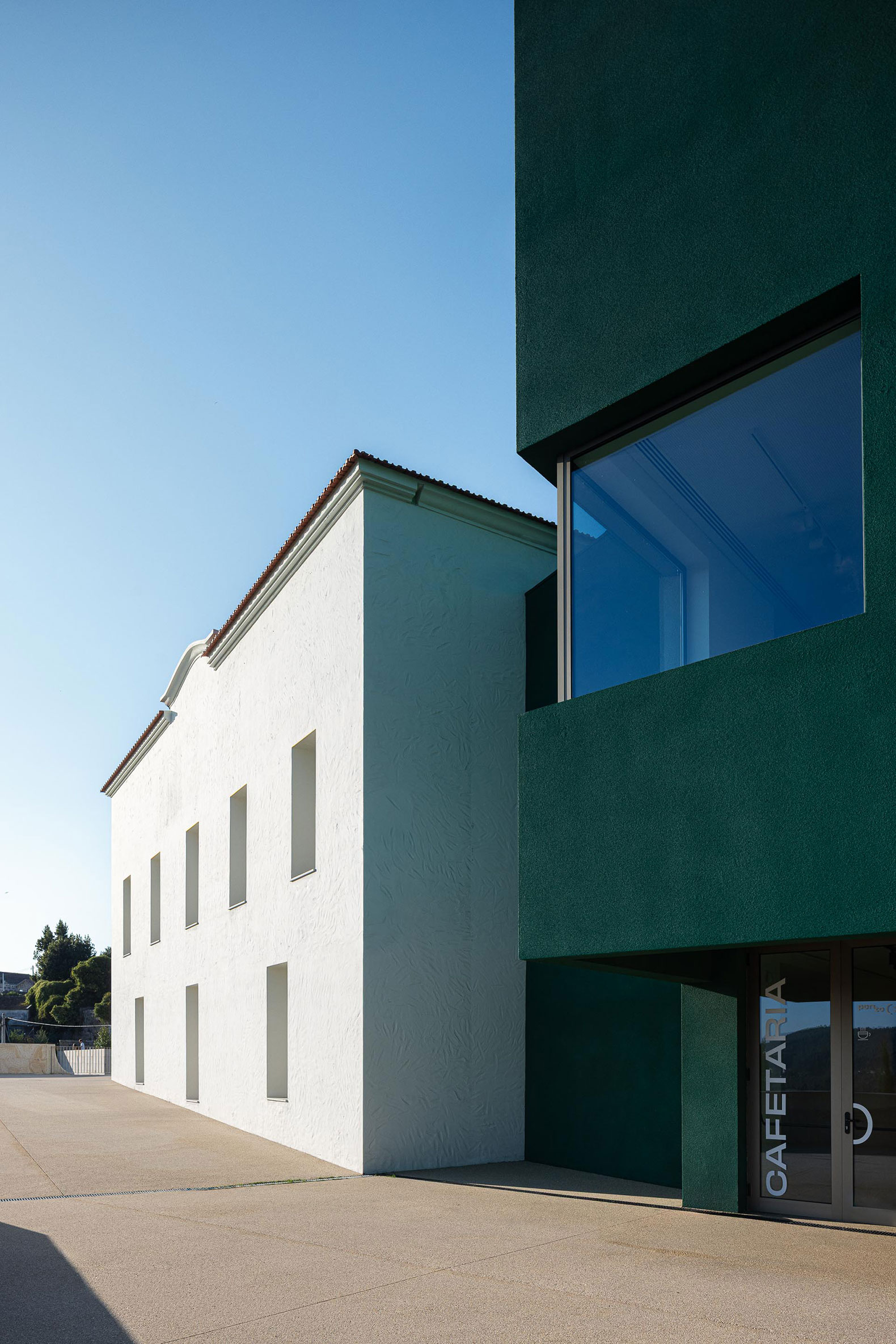 Anticipando una gran presencia volumétrica y considerando la diferencia de topografía, el edificio se esconde entre vegetación y magnolias. La presencia de la antigua estructura se mantiene, dando paso a nuevas texturas y funciones; sin embargo, lo que destaca es la audacia de su color: el verde, que con el tiempo se espera que se integre gradualmente con la vegetación circundante. El corcho proyectado se ve diferente según el ángulo y la luz, como si ofreciera múltiples interpretaciones de una obra artística.