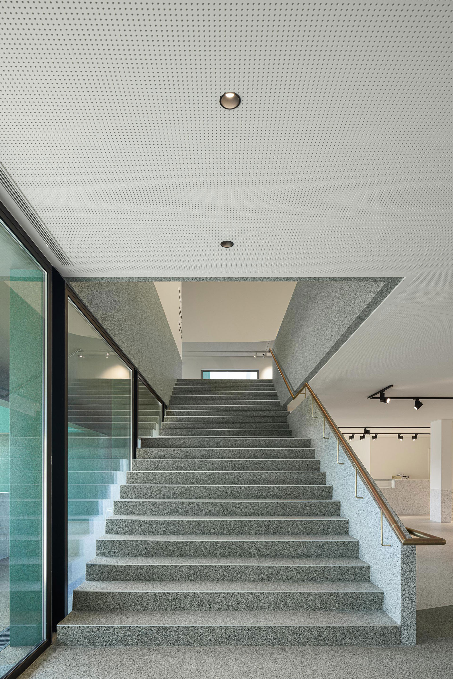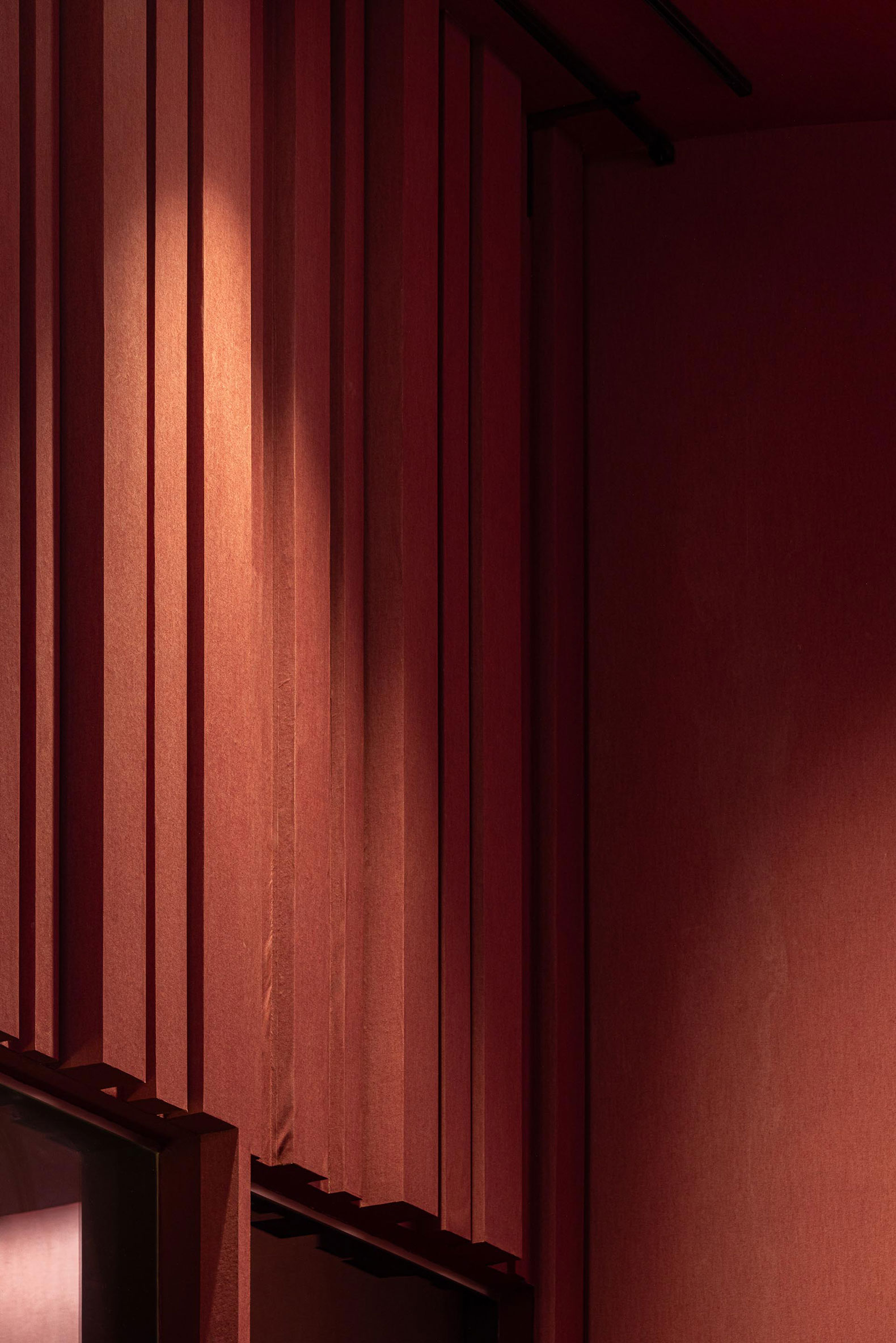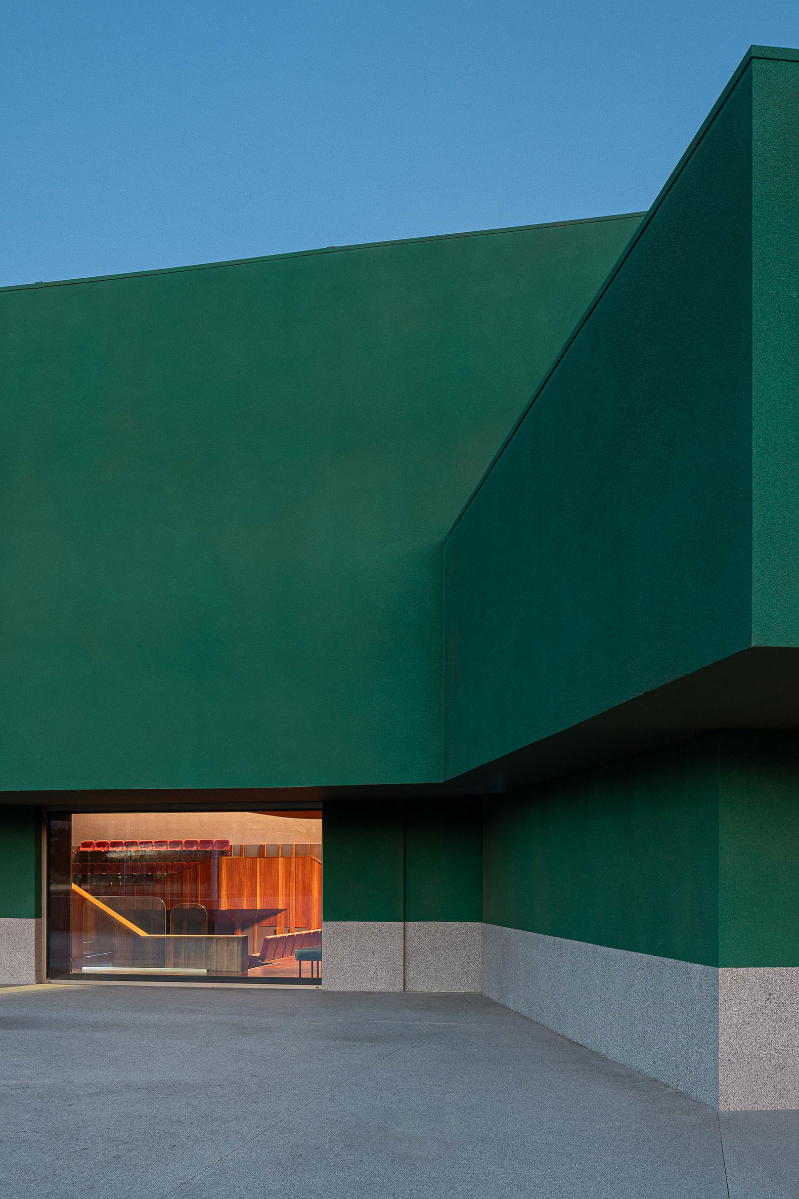 Si la plaza de recepción actúa como una alfombra de bienvenida que guía a los visitantes al interior, el auditorio contrasta con el exterior, formalmente vestido, donde los tonos rojos intensos infunden calidez al espacio que espera al público.
