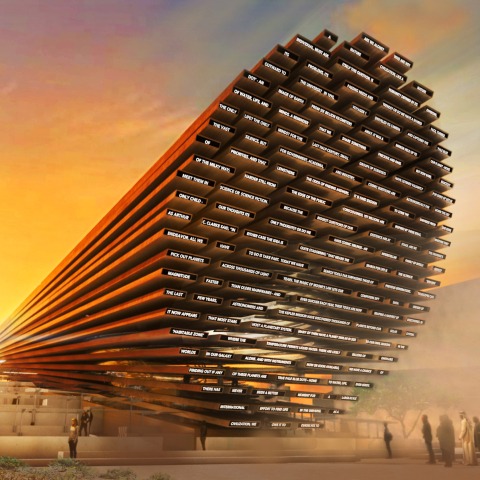 Es Devlin OBE es conocida por crear impresionantes esculturas performativas a gran escala que fusionan tecnología y poesía, incluida la escultura interactiva Fifth Lion instalada en Trafalgar Square. Su diseño para el Pabellón del Reino Unido es un mensaje escultural iluminado al que se invitará a cada uno de los 25 millones de visitantes previstos en la Expo.