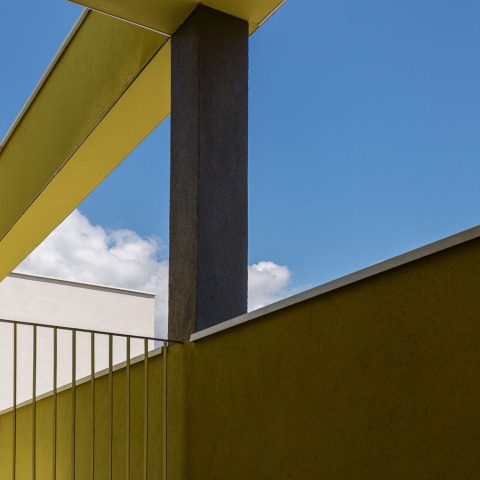 En las partes bajas, una hoja exterior cerámica dispuesta en diferentes despieces funciona a modo de zócalo. En las partes altas la fachada acaba con revoque, sobre un aislamiento continuo. La compartimentación interior está formada con placas de cartón-yeso y estructura de acero galvanizado con barandillas y carpintería de madera.