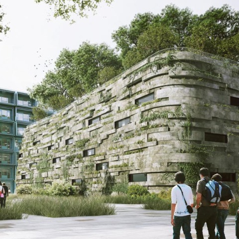 Este interesante proyecto diseñado por el estudio de Chartier Dalix Arquitectos mezcla un gimnasio público y una escuela, y ambos son cubiertos con una concha "viva", recibiendo una gran variedad de fauna y flora local, desde insectos a búhos a través de diferentes especies de árboles y plantas. El objetivo principal ha sido simular un ecosistema en sí mismo, un paisaje y una vista para los edificios de los alrededores, un rico campo de exploraciones y descubrimientos para los niños.