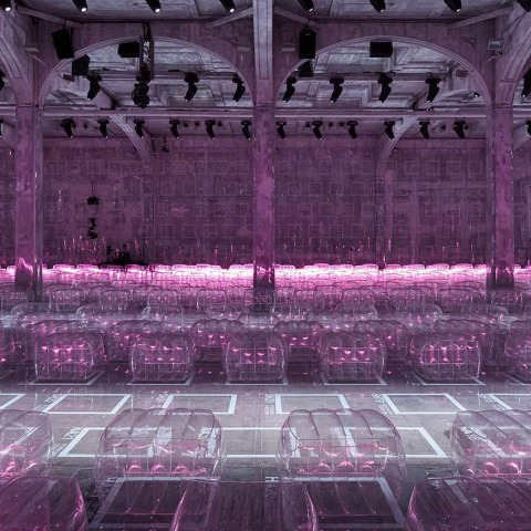 Prada ha colaborado nuevamente con AMO para su espectáculo de Moda Hombres Primavera / Verano 2019, estableciendo un conjunto que es industrialmente elegante y psicodélico. Ubicado dentro del espacio de la casa de moda Fogazzaro en Milán, el espacio expositivo se trata como un campo arquitectónico dividido en una serie de cuadrados etiquetados con coordenadas geográficas que definen el posicionamiento de los invitados del espectáculo. Para completar el set, se coloca una reedición exclusiva de taburetes inflables, producidos por primera vez en la década de 1960 por el reconocido diseñador danés Verpan Panton, dentro de cada cuadro.