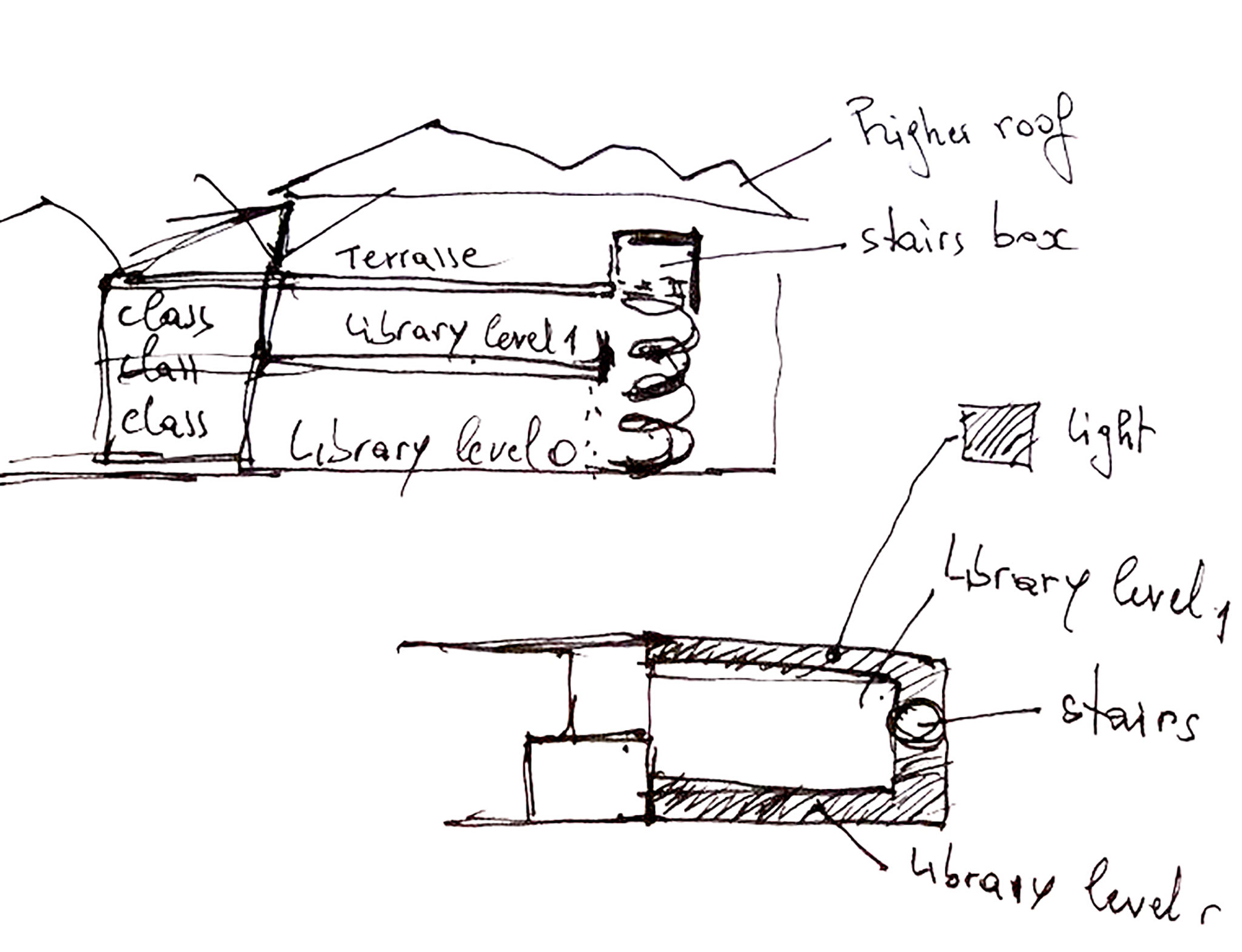 La programación pública se concentra en la planta baja, que alberga un auditorio, una cafetería y la biblioteca. Las oficinas administrativas y las aulas ocupan la primera planta. Coronando el edificio, una cubierta proporciona sombra en todos los niveles, mejorando el aislamiento térmico y protegiendo el interior de la lluvia, a la vez que evoca las formas naturales y orgánicas de los árboles y el jardín. En todos los niveles, el diseño prioriza un enfoque sostenible, asegurando que el edificio tenga un impacto mínimo más allá del espacio físico que ocupa.