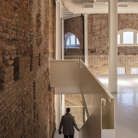 Ipiña+Nieto Arquitectos respetan la envolvente existente sin alterar su función escénica en el acceso y vacían su interior. La acción de des-densificar el muro hace posible apropiarse de un lugar sin inventarse un material.