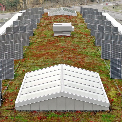 En la cubierta plana, se colocan unos grandes aleros para controlar el soleamiento directo en el espacio de oficinas, y sobre ella, se dispone una cubierta vegetal con paneles solares para reducir la huella medioambiental del conjunto.