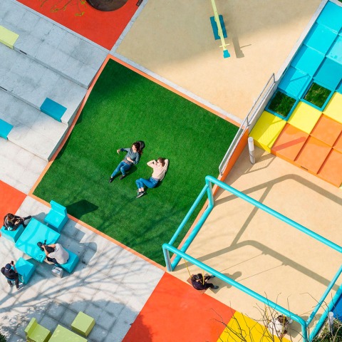100 architects realiza Pixeland, un espacio público inspirado en el concepto digital de píxeles, que comprende una combinación de diferentes instalaciones al aire libre en un solo espacio: elementos de paisajes, elementos de juego para niños y entretenimiento para adultos.