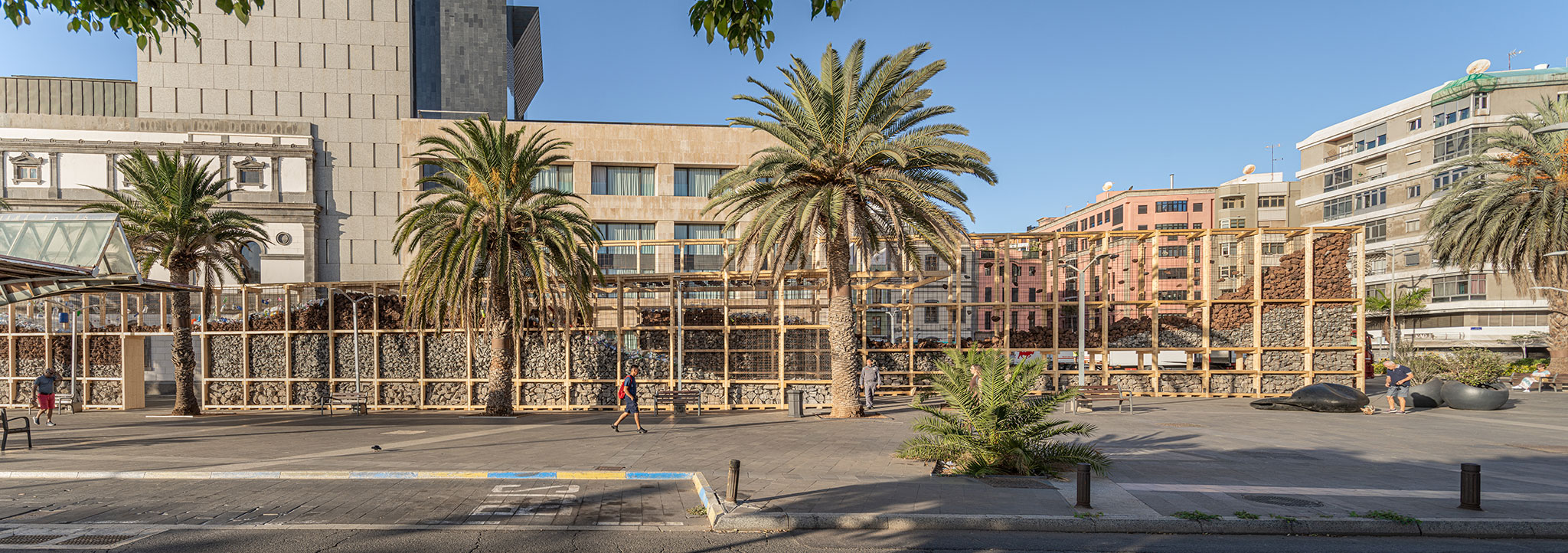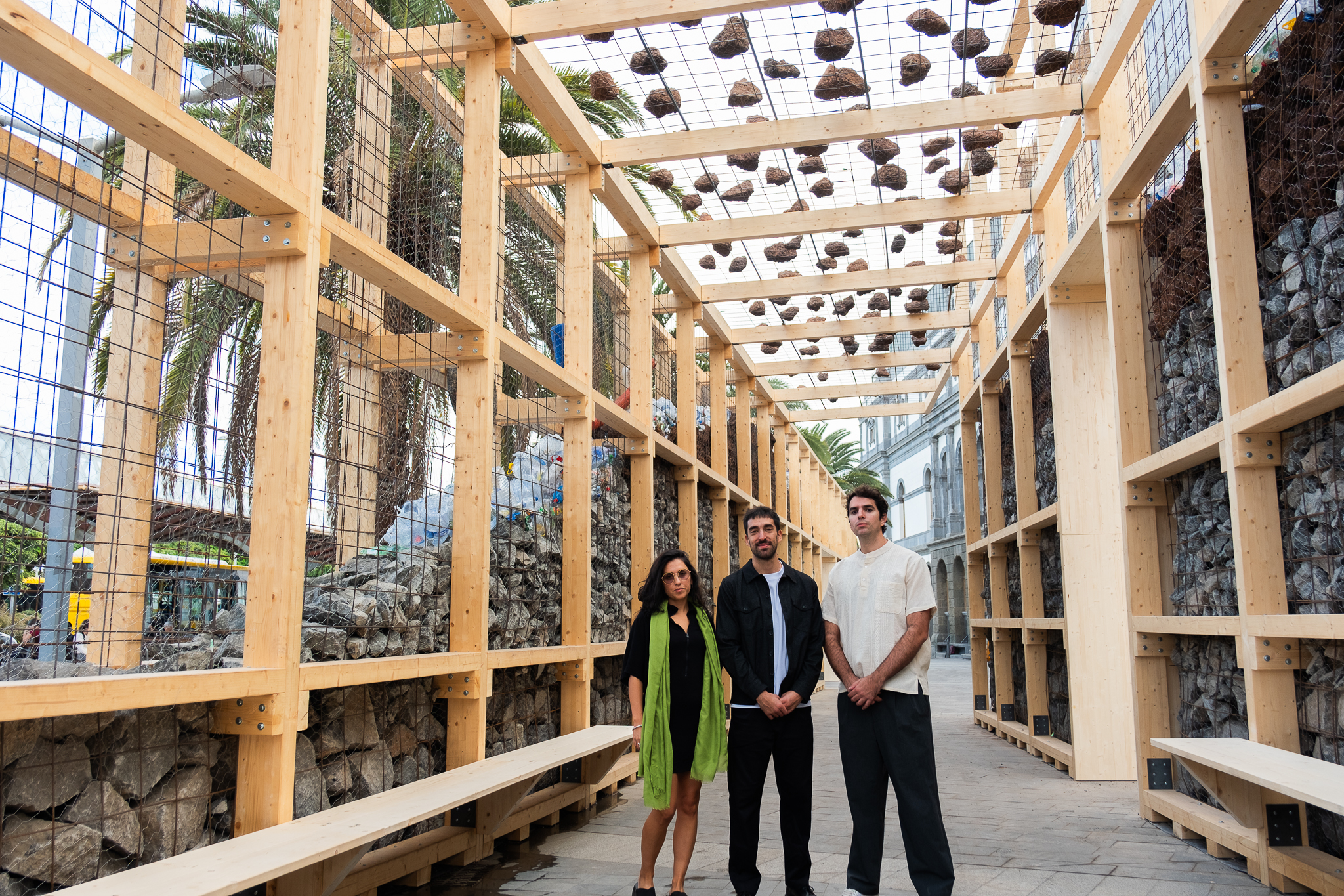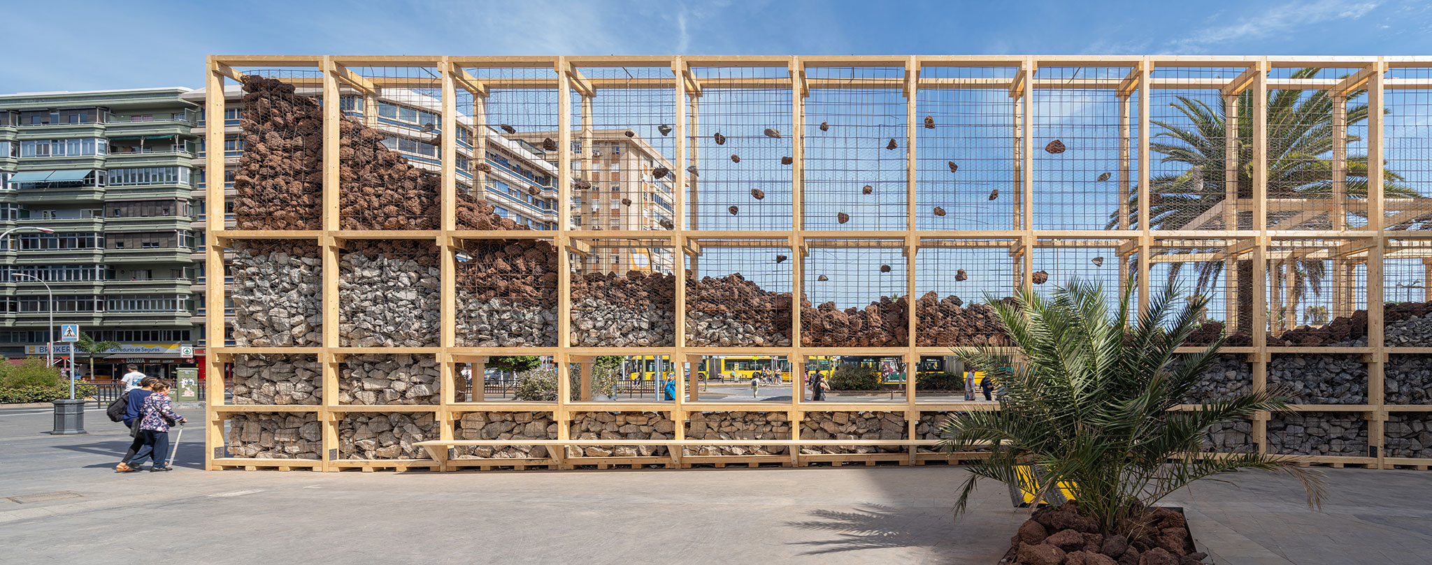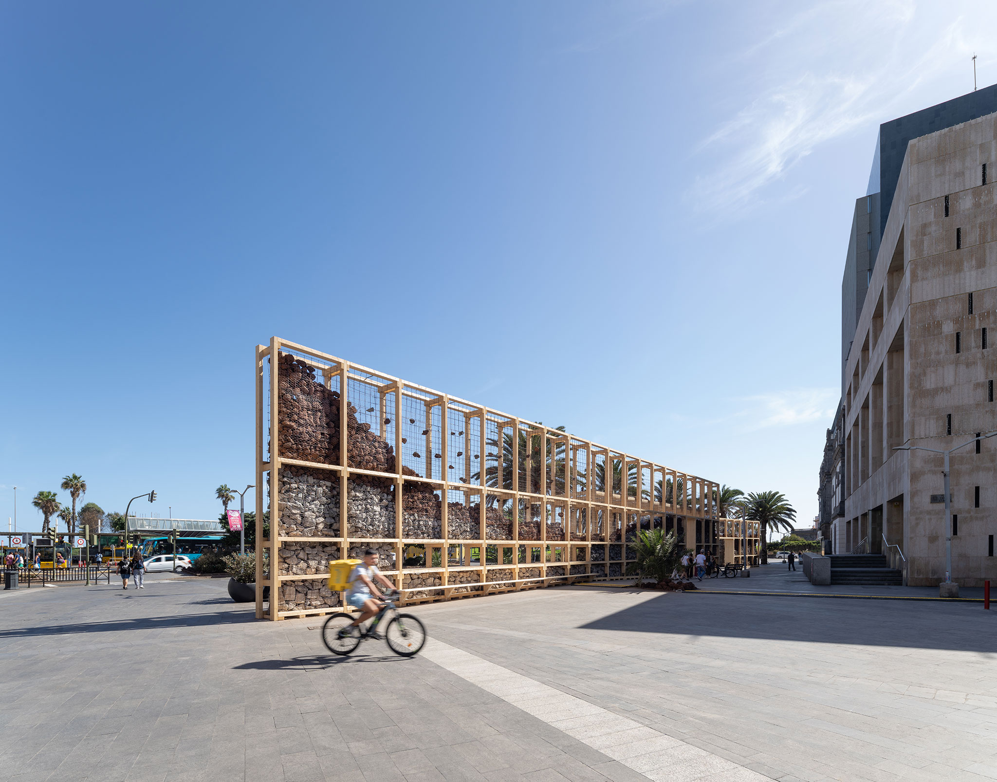 El pabellón «De Roca Madre», realizado por Alejandro Carrasco Hidalgo, Eduardo Cilleruelo Terán, Alberto Martínez García y Andrea Molina Cuadro (Estudio Latente), constituye el segundo pabellón en la segunda sede de esta edición de TAC!, que arrancó con la presentación de «ESPARTAL» en Alicante. El objetivo de esta instalación temporal es transformar la Plaza de Stagno en un espacio vivo, pedagógico y simbólico, en el que se toman como referencia las piedras volcánicas que caracterizan el territorio, confrontadas con los residuos plásticos encontrados en las playas de la isla.
