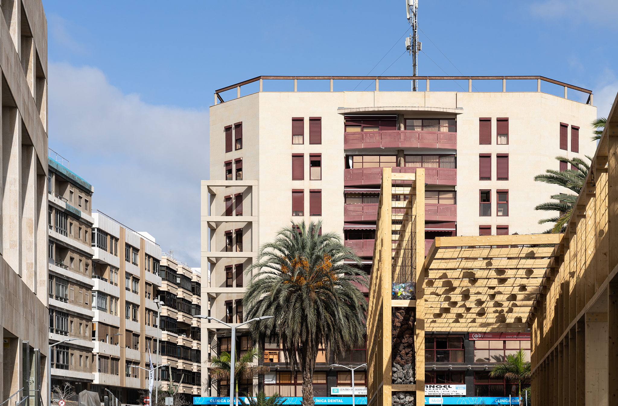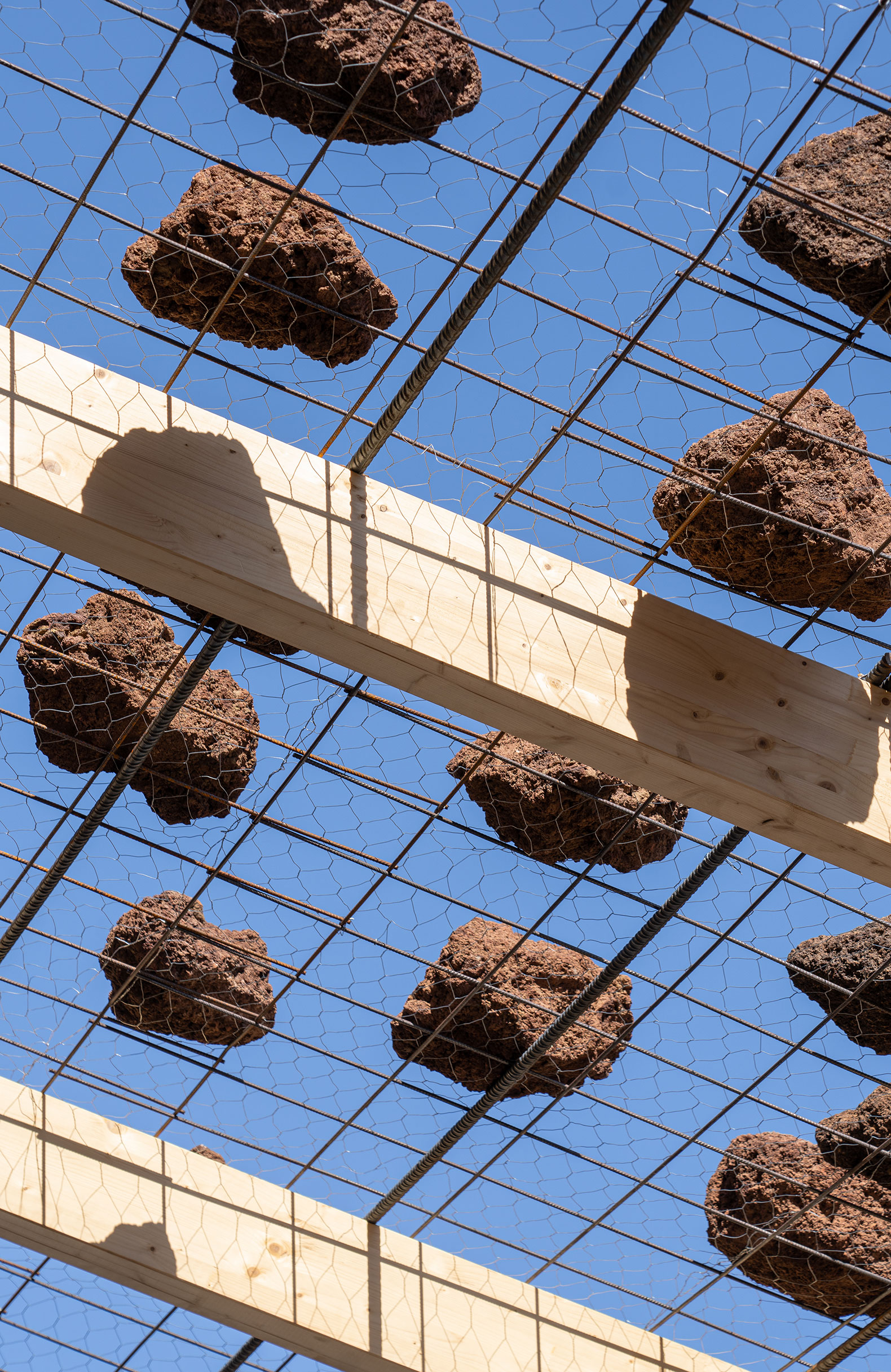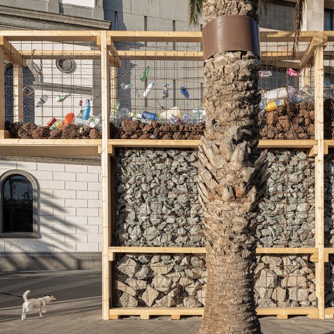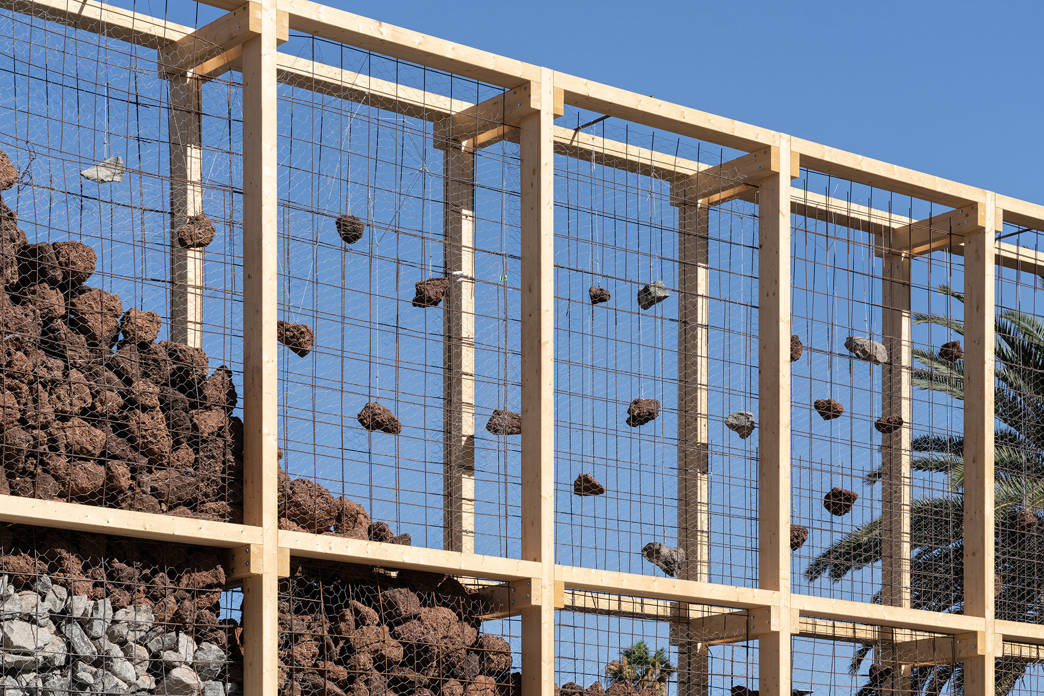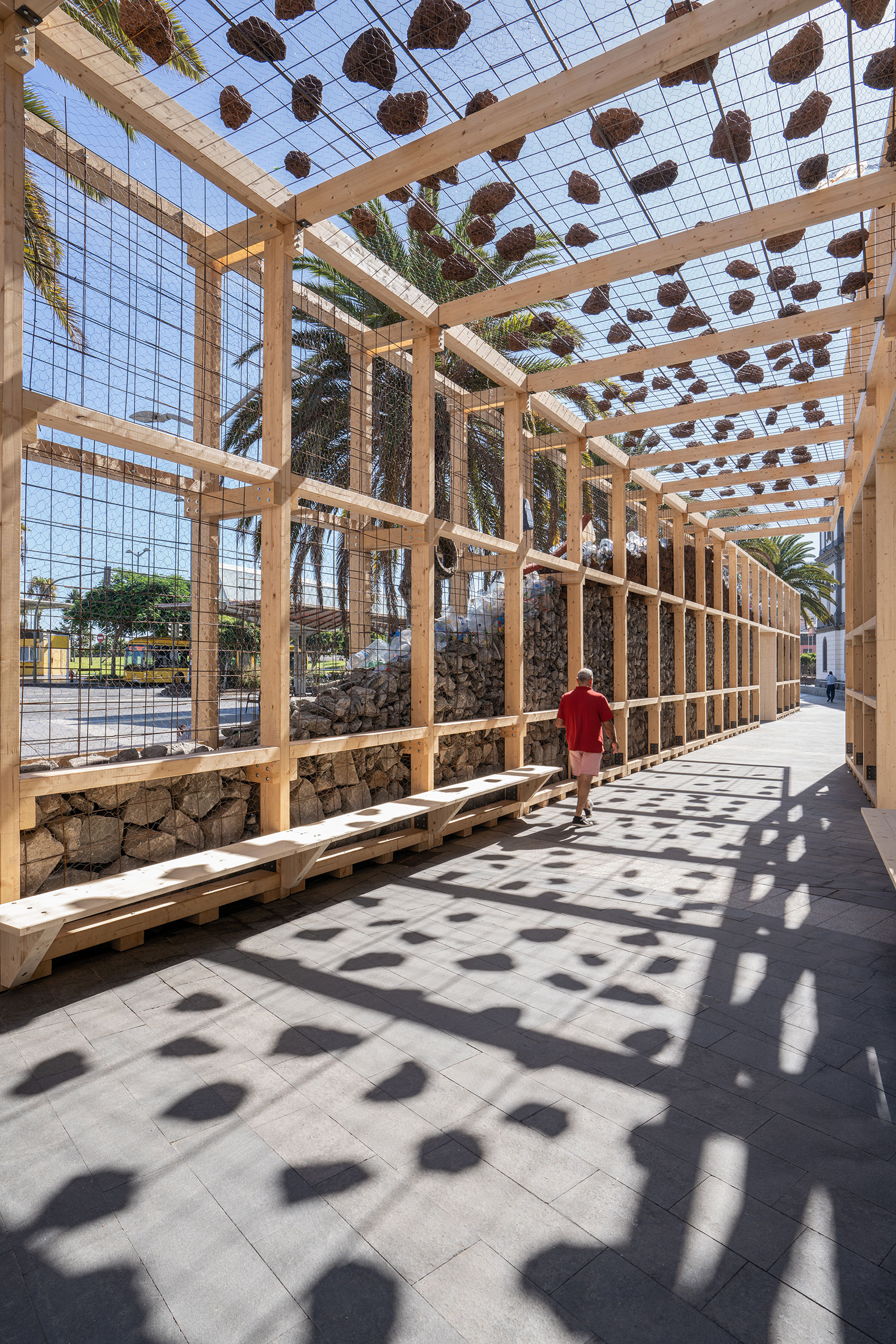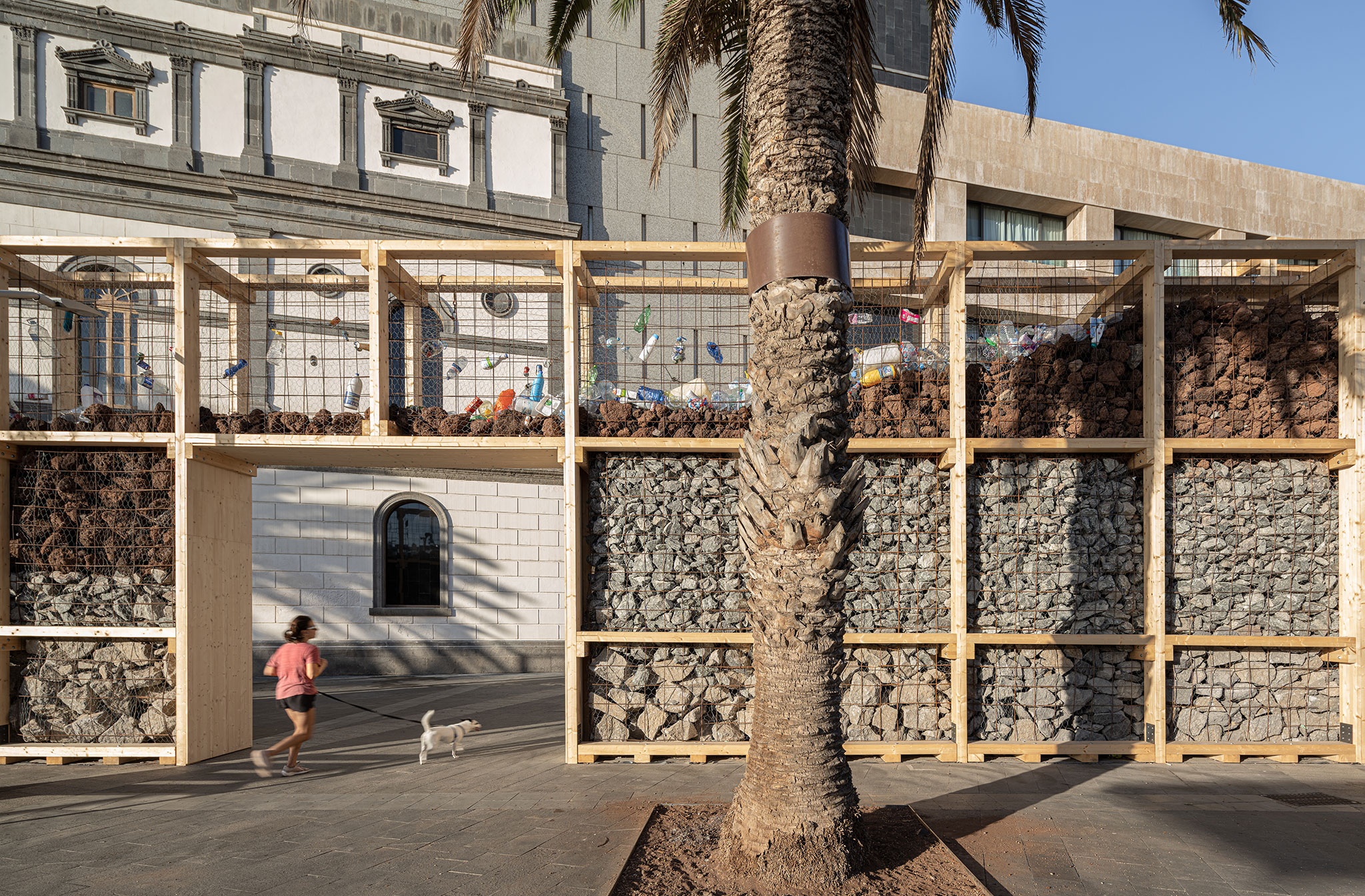 «De Roca Madre» Representa la geodiversidad de la isla y el impacto humano contemporáneo a través de residuos plásticos. Evoca la construcción tradicional canaria, y a la vez se proyecta hacia el futuro al abordar una problemática contemporánea: la acumulación de residuos y microplásticos en las costas. Su diseño invita a reflexionar sobre el tiempo reflejado en los estratos de la isla y sobre el gran impacto del Antropoceno en el ecosistema actual.