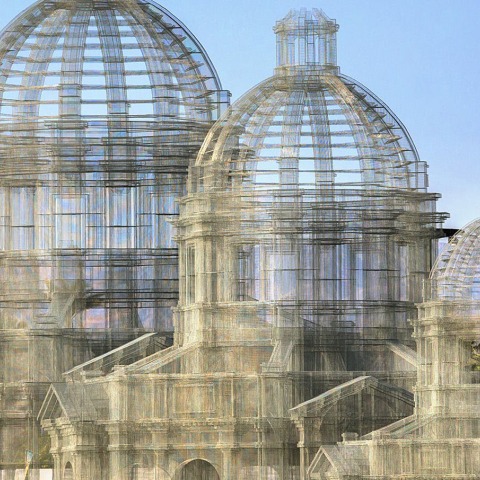 Las "estructuras" respiran a través de las nubes y el viento, transfiriendo el arquetipo cósmico del cielo en cúpulas efímeras a través del lenguaje de la arquitectura clásica. Los ritmos rotos de la malla de alambre generan secuencias de abstracciones arquitectónicas y puntos de vista amplificados. El efecto óptico cambia con la luz y las condiciones atmosféricas, así como la perspectiva del espectador.