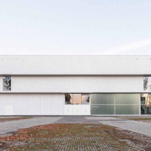 El pabellón se abre especialmente en su parte este hacia el río y la ciudad. Materialmente, la apariencia externa toma dos formas: sólida y transparente. Para la forma sólida, el material elegido son casetes de metal blanco y lámina de techo blanca. La forma transparente se aborda con vidrio, ya sea un acristalamiento estructural transparente o el material más íntimo de copilite. El uso de vidrio perfilado también es una referencia a la arquitectura original. Se complementa con ventanales de gran formato que abren el espacio interior con una solución contemporánea.