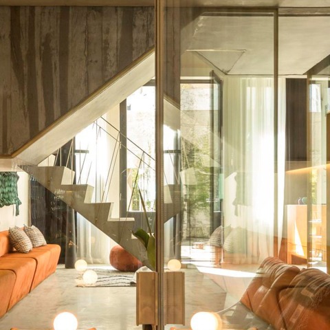 La planta baja del hotel, que incluye un amplio Café Cultural, sigue siendo un espacio largo y flexible, que da acceso al patio central y al patio trasero. Se utiliza como "escenario" para diferentes eventos culturales -conciertos, talleres, exposiciones, presentaciones de libros-, intermediando entre el exterior y el interior, y puede adaptarse a las necesidades diarias.
