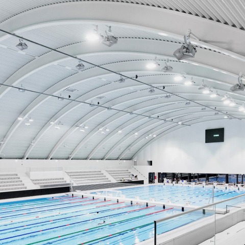 Dos unidades geométricas articulan el volumen principal, una de ellas es el espacio abovedado de cañón de la piscina de competición y las áreas de servicio en forma de L. Las superficies de vidrio y estriadas suavizan los volúmenes de los monolitos.