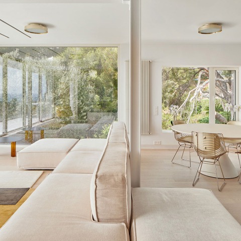 Ubicada en Castelldefels, un pequeño pueblo de costa cercano a Barcelona, la parcela, de forma alargada y escalonada, tiene una orientación prácticamente norte-sur, situándose al sur las amplias vistas hacia el mediterráneo. Esta direccionalidad ha sido reforzada tanto en el concepto exterior como en el interior, de manera que la casa ahora surge como un volumen blanco desde una base aterrazada de mármol en la que se van sucediendo pequeñas plataformas y jardines, que descienden hasta la zona de piscina, resuelta en el mismo material, y las zonas ajardinadas, hasta llegar al pabellón de sauna, proyectado sobre un antiguo almacén existente que se encontraba en ruinas. El fuerte desnivel que tiene la parcela facilita que todos los espacios exteriores tengan una clara conexión con las vistas del mar. Todos los exteriores se han tratado de forma homogénea, para dotarlos de unidad, mediante una paleta reducida de materiales, de los que surge la masa blanca de la casa existente, la cual, hacia el exterior, se ha tratado de la misma manera homogeneizando materiales y acabados.