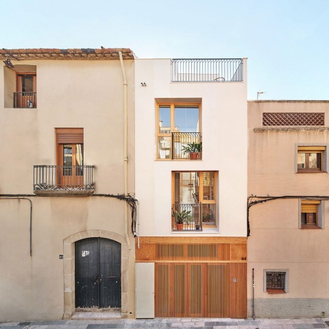 En coherencia con el concepto de la vivienda, la fachada posterior del patio orientada a suroeste se ha concebido como un gran espacio captador vidriado que permite que toda la casa reciba la máxima iluminación posible en invierno, disponiendo de persianas de protección solar en verano. La fachada que se presenta a la calle, en cambio, de orientación nordeste, más pesada, presenta una composición de llenos y vacíos que busca establecer un diálogo y una continuidad con la morfología de las casas entre medianeras del centro histórico de Vila-seca.