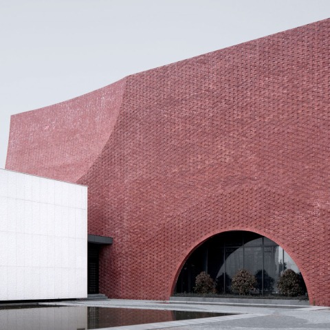 La sala de exposiciones más grande que se extiende a lo largo de la calle tiene la pared exterior de ladrillos rojos, como un sello condensado impreso en el elegante rollo de tinta y lavado. La forma de cortar la esquina a través de la superficie del arco refuerza el carácter icónico del edificio a lo largo de la calle, formando un atractivo duradero único. El ladrillo rojo es el ladrillo de arcilla Yixing, y adopta tres tipos de revestimiento de acuerdo con las diferentes ubicaciones. La parte inferior del ladrillo sobresale de la pared, y la parte superior se introduce en la pared, y la parte cortada queda planamente forrada, formando diferentes texturas.