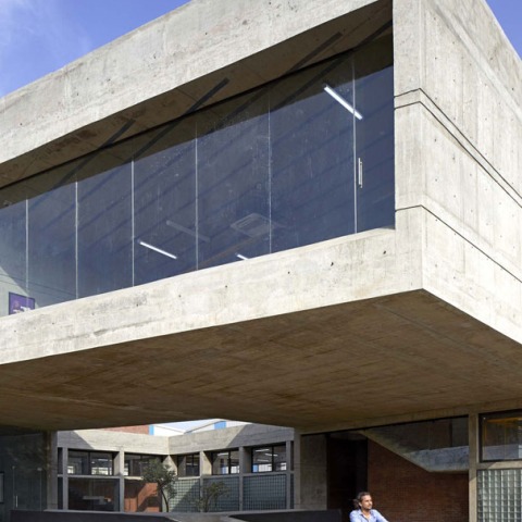 La materialidad pesada del concreto "colado en el lugar" del bloque "poroso" contrasta fuertemente con el revestimiento de acero ligero pero opaco de los edificios circundantes.