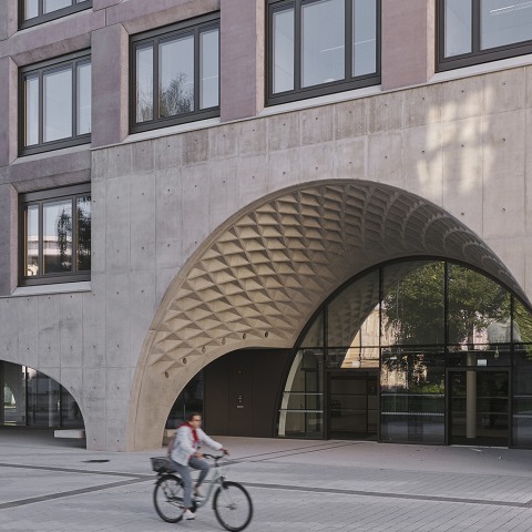 Un atrio forma el corazón del edificio de la universidad. Proporciona orientación y crea espacios de encuentro y comunicación. Como mediador democrático, abre la variedad de funciones de la casa a través de escaleras voladas. La amplitud del atrio permite largas relaciones de visualización y permite la iluminación natural para las estaciones de trabajo temporales en el interior. Oficinas y puestos de trabajo permanentes orientados al exterior, ofreciendo iluminación y ventilación natural, además de vistas a la ciudad.