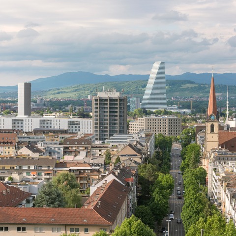 La sencilla aunque llamativa forma así como al altura del edificio anclan firmemente los principios de Roche con el entorno urbano. Dada su geometría, Building 1 parece enteramente diferente según el ángulo de visión, creando un referente reconocible según desde que parte de la ciudad sea visto. Al sur, visto desde el Rin, parece una cuña escalonada. En función de la luz que refleje la fachada, las balaustradas y las ventanas se funden en un volumen de luz que se disuelve hacia el cielo. Desde el este y oeste, a lo largo de Grenacherstrasse, parece una torre vertical, delgada y escalonada, cuyo contorno destaca por sus balaustradas tridimensionales. La luz y las sombras además acentúan esta impresión. Las plantas inferiores del edificio entran en relación con la escala de calle gracias a las ventanas. Por lo tanto, se da una transición nada problemática que se puede lograr desde la escala humana hasta la elegante fachada norte y sur del edificio, que encaran la escala urbana.