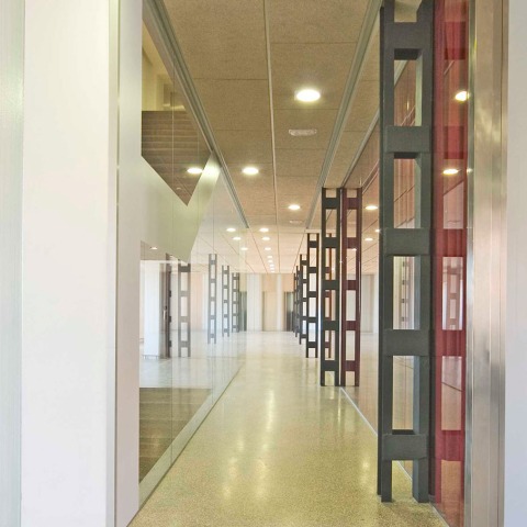La intervención se articula en torno a muy pocos materiales y a dos piezas propuestas en el proyecto: una cortina roja y la nueva escalera. Con estas dos piezas se marcan las pautas de la intervención, el espacio se define por el flujo de visiones y movimientos cambiantes que posteriormente producirán sus visitantes y no como respuesta a la formalización de los muros, que tan sólo es circunstancial. La percepción de ambas piezas depende del movimiento: en el caso de la escalera su percepción sólo es entendible recorriéndola, subiéndola, bajándola y penetrándola desde el ascensor, sus flujos varían no sólo en función del programa al que responde sino también por su evidente exposición a la luz cambiante del este y del oeste; y en el caso de la cortina porque su posición depende de su tránsito por los carriles, manteniéndola abierta o cerrada, las visiones hacia el interior o el exterior permiten un percepción diferente.