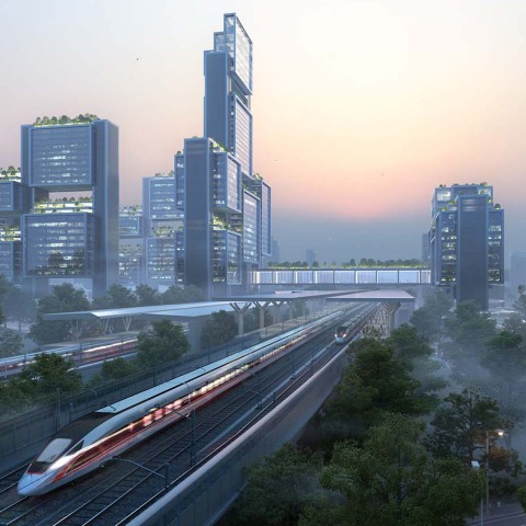 Un gran podio comercial se encuentra en lo alto del metro y las estaciones de enlace interurbano, con terrazas verdes escalonadas que crean un enlace con el bosque circundante, mirando hacia la columna verde central. Hay una serie de torres de oficinas, situadas en puntos cardinales en todo el sitio. Inspiradas en la puerta de entrada tradicional china que marca las entradas importantes, estas torres se conciben como "puertas de entrada" al centro. Las aberturas en el nivel del suelo de los edificios de la torre marcan el acceso central a la estación de tren de alta velocidad. Los metros y los puentes a las parcelas vecinas crean conexiones convenientes para peatones, ciclistas y vehículos autónomos. Un nuevo museo del transporte está situado en el puente sobre la estación de tren de alta velocidad, que conecta las mitades este y oeste del sitio. Los visitantes disfrutarán de exhibiciones de exhibición futuristas que utilizan las últimas tecnologías de realidad virtual, realidad aumentada y mapeo de proyección frente a la vista panorámica de la estación de tren de alta velocidad.