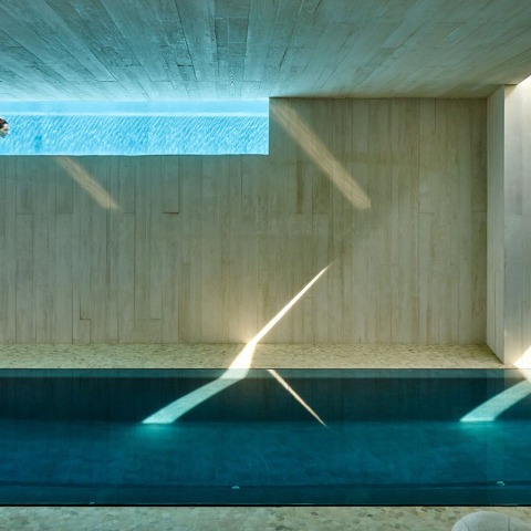 El panorama queda enmarcado entre la arquitectura y el agua de la piscina, que se recorta contra el horizonte. Una de sus particularidades más estimulantes son los largos voladizos de porche, que por su sistema constructivo, se encajan entre los muros en lugar de apoyarse en ellos, consiguiendo un efecto visual que se acerca a lo imposible. La vivienda posee una gran expresividad material, gracias al uso de acabados con fuertes texturas, como el hormigón y la madera blanqueada. La abstracción formal se combina con una materialidad telúrica, en un sutil juego de contrastes.