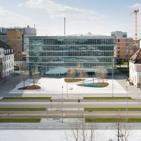 El edificio está ubicado frente a Frankfurter Straße, generando así el espacio para una plaza pública - Emanuel Merck Platz.