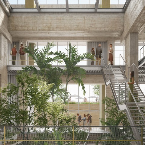 «Hemos proyectado una propuesta que juega con las conexiones y los nudos: temporales, paisajísticos y territoriales. Unos cortes transversales crearán este bloque más poroso y permeable, permitiendo a usuarios y a vecinos atravesarlo para ir de la ciudad hacia el mar y la vegetación autóctona se infiltrará por aquellos vacíos interiores. Este equipamiento se configurará como un elemento de costura entre la costa de Barcelona y la del Maresme: por primera vez habrá un balcón abierto en dirección Badalona. Los elementos arquitectónicos ofrecerán nuevas perspectivas paisajísticas como si se tratara de una obra de Landart.»