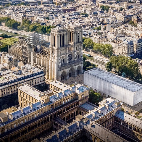 Replicado en las mismas dimensiones que Notre-Dame para garantizar la familiaridad, la estructura temporal recuerda los ritmos estructurales y las formas de la catedral gótica. Con un techo construido con cojines de ETFE y paredes hechas de policarbonato translúcido, la estructura temporal se inundará de luz natural, enfatizando la calidad etérea del espacio y creando un alivio visual.