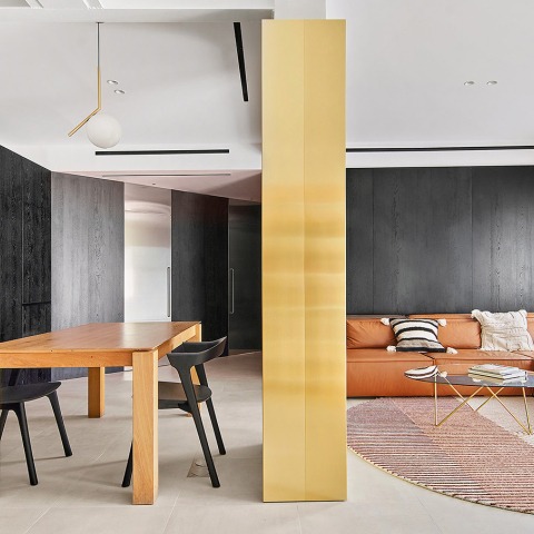 Conceptualmente el triángulo es el generador de los espacios, estableciendo el giro de la planta, y esta idea formativa, el triángulo, la diagonal, se reproduce en multitud de detalles menores: el pilar central de latón es en realidad un trapecio con un lado en diagonal; muebles diseñados ex profeso en latón repiten el motivo del triángulo; la puerta de acceso al baño en-suite, una gran puerta pivotante de acero inoxidable cepillado, se divide en dos partes para aportar intimidad, mediante una diagonal que le dibuja un triángulo, al igual que ocurre con el despiece del mármol del mismo baño. Incluso el despiece de las baldosas de 60x60 del espacio central, para resolver la longitud de 615cm, dibujan una diagonal con piezas de 15cm intercaladas.