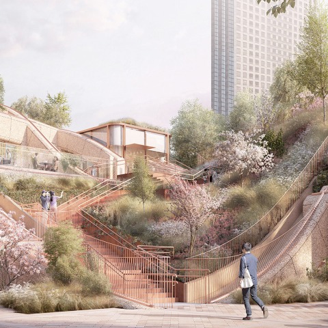 Trabajando con una parcela complicada de forma irregular que abarca más de ocho hectáreas, el estudio ha tratado de traer armonía y crear una identidad distintiva que sea particular de Tokio. El equipo ideó un sistema similar a una pérgola ampliado a las proporciones del distrito para organizar y unificar muchos elementos diferentes de varios tamaños. De esta manera, el diseño permite un espacio verde significativo tanto a nivel del suelo como para subir los edificios del podio, sin sacrificar la conectividad al suelo. Haciéndose eco de las formas naturales de la configuración del valle del proyecto, la estructura ondulada se eleva como una ladera suavemente inclinada antes de perforar el suelo para permitir que la luz natural se vierta profundamente en las zonas comerciales del sótano.