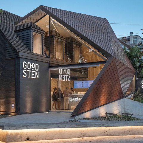 GOODSTEN no es solo una cremería, nace de una experiencia de paisajes oníricos de otros mundos, como si se tratara de un planeta donde existe otra lógica. Paisajes desconocidos y fantásticos nos han remitido a piedras preciosas cuya superficie facetada nos inspiró para generar un sistema constructivo. Aquellas rocas que por dentro nos deslumbran con sus brillos y texturas acristaladas, como diamantes de otro planeta.