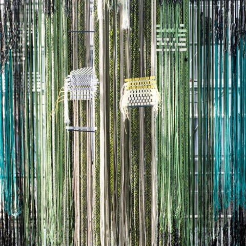 El diseñadora holandesa crea un gigantesco laboratorio textil, instalado en el atrio del edificio de la fundación, donde desde pequeñas plataformas, los tejedores entrelazan hilos de trama, como músicos que tocan en un instrumento enorme.