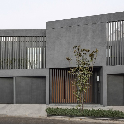 Su fachada de estuco gris oscuro enfatiza su esencia tectónica y monolítica. Por otro lado, los paneles y módulos de madera de roble claro en el interior unen adecuadamente los contrastes y neutralizan la luz, creando espacios tranquilos, frescos y orgánicos.