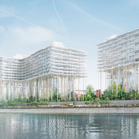 La operación única de elevar el nuevo edificio a 35 metros en el aire aporta tres ventajas clave para el proyecto: primero, la nueva área verde, un parque urbano, emerge en las tierras desocupadas bajo las estructuras flotantes, entre los edificios patrimoniales y el río frente; segundo, a pesar de la densificación sustancial del sitio, los edificios históricos conservan su conexión directa con el río y su clara visibilidad y acceso a la ciudad; y tercero, todos los pisos de la estructura flotante son pisos superiores con vistas excelentes a la Cervecería, Kutuzovskiy Prospekt, Ukraina Hotel, la Duma Estatal, la Ciudad de Moscú y más allá a la gran Moscú. Al correr a lo largo de la línea argumental frente al río, el nuevo edificio elevado sigue los contornos de las estructuras patrimoniales y la orientación establecida norte-sur de la antigua red industrial. La forma ondulada resultante se asemeja a la geometría de los edificios serpenteantes frente al mar en esta parte de la histórica Moscú y maximiza las vistas hacia el río.