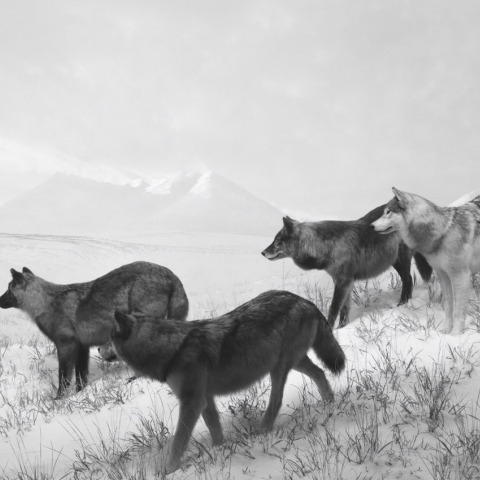 Dioramas (1976-2012).- Reúne fotografías de tableaux de paisajes prehistóricos tomadas en su mayoría en el Museo de Historia Natural de Nueva York. Son imágenes de animales embalsamados y humanos primitivos que parecen engañosamente reales, con las que el artista logra poner en entredicho nuestra percepción de la realidad y la fiabilidad de la fotografía como prueba; muy buenos ejemplos del interés de Sugimoto por situar al espectador en la frontera entre lo animado y lo inanimado, al dotar a sujetos y paisajes sutilmente extraños a la imaginería contemporánea de una verosimilitud desconcertante.