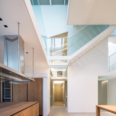 La escalera se estudia en el sistema original de columnas de la granja. Los espacios en la primera planta subrayan la yuxtaposición del cuerpo central del ala este a través de la introducción de una escalera doble que une todos los niveles internos, apareciendo como cajas transparentes que cuelgan en el volumen.