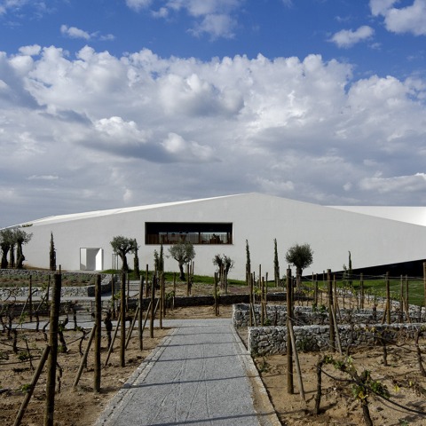 Inspirado en los patios amurallados encalados de Alentejo, el edificio fue concebido como un prisma con bisagras de la que sus cuatro esquinas eran de corte (recepción, chill out, restaurante con terraza e industrial), la creación de zonas de sombra e intimidad. Topográficamente, el volumen ha sido ubicado cuidadosamente para cumplir con los contornos de la planta con el menor cambio. El ventanal de la piscina cubierta en la planta baja, sugiere a sí mismo como una pared doblada para liberar las vistas del paisaje. En el interior, frisos estriados de madera de roble y pizarra gruesa negra de Alentejo, transmiten un ambiente de confort y cálido, creando un fuerte contraste con la rugosidad de las áreas diseñadas para la operación de producción de vino.