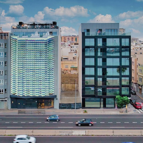 El hotel urbano SILKEN SAAJ se localiza en la primera línea del frente marítimo de Las Palmas de Gran Canaria, ocupando una posición liminal en la confluencia entre la bahía, la playa de Las Alcaravaneras y el Puerto de La Luz. El emplazamiento —con exposición directa al mar, orientación este y colindancia con una arteria de alta densidad vehicular transitada por 135.000 vehículos diarios— impone un paisaje complejo donde la incidencia de la luz solar directa y el ruido del tráfico constantes configuran una situación de alta exigencia ambiental. Estos dos estímulos dominantes —luz y ruido— son codificados como variables primarias para el diseño y activación del sistema envolvente. La estrategia proyectual, bien lejos de tratar de aplacar estos estímulos, busca reintegrarlos como materia operativa del diseño.