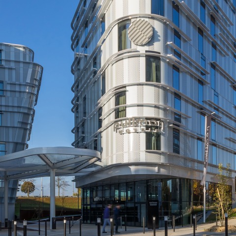 El proyecto del hotel fue diseñado para integrarse perfectamente en su entorno cercano, en articulación con la "Cúpula" y la futura terminal T4.
