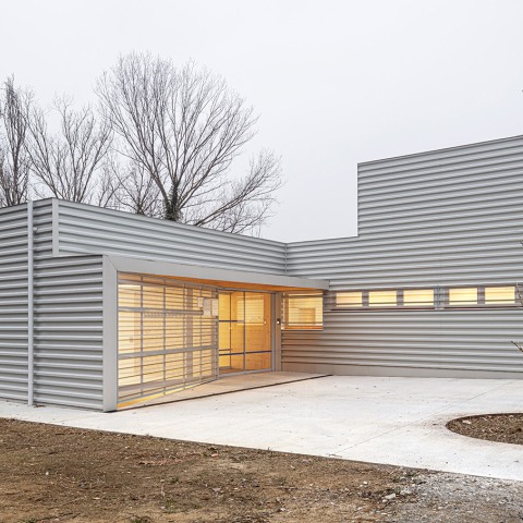 La fachada ventilada con plancha lacada grecada permite realizar los elementos de cierre y protección solar cuando se microperforada, con una sola materialidad, pero consiguiendo distintos matices y percepciones del material, preservando la intimidad cuando es necesaria.