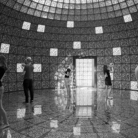 Sin embargo, no sólo el proceso interactivo, sino el espacio del propio pabellón (en especial, su sala central cubierta por una enorme cúpula), está totalmente ornamentado con códigos QR, que parecen parpadear y reverberar en el suelo de espejo, generando una mayor impresión y provocando una declaración arquitectónica fuerte. Hoy en día no sólo Internet y las nuevas tecnologías de la información conectan gente "Common Ground", sino que también lo hacen con las formas clásicas de la arquitectura.