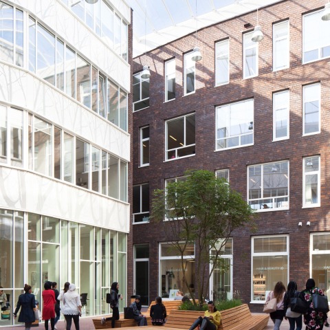 El nuevo edificio es parte del tejido económico y social de la ciudad de Leiden. Un pasillo central atraviesa el complejo, que conecta el Breestraat y Boommarktand, pasando a través del atrio. Durante las horas de clase, este callejón es accesible al público. Las fachadas transparentes permiten a los transeúntes ver salas de ensayo y otras funciones públicas que van de la calle al atrio. Esta orientación de los puntos de vista desde lo público a lo privado ofrece un ambiente seguro para los estudiantes y el personal.