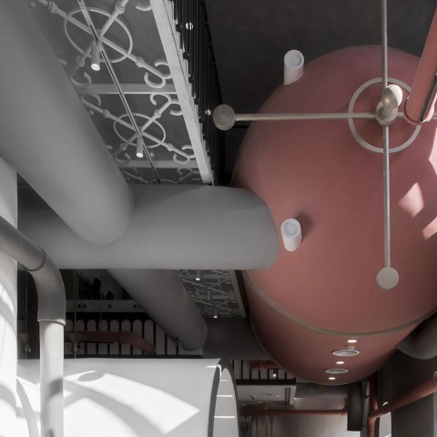 Derribamos las losas del forjado del espacio original de dos plantas, y lo convertimos en un espacio de 8 o 9 metros de altura. Restauramos el espacio con un enfoque minimalista y diseñamos dispositivos que ofrecen una nueva experiencia de venta minorista en los "tanques de reacción". Los consumidores podrían tener nuevas y diferentes experiencias de consumo traídas por varios dispositivos en diferentes tanques. Y reconstruimos el forjado en un espacio de 4-5 metros de alto; están entrelazados con los "tanques de reacción" que restauramos, y actuaron como trabajo compartido y plataforma de transporte para el personal de I+D en el segundo piso. De esta manera, el personal está trabajando en las plataformas en el aire, mientras que los consumidores de la planta baja experimentan experiencia comercial gracias a la nueva tecnología y la información. La interacción visual en este espacio elevado les hace sentir la existencia de los demás y hace que el espacio sea más interesante. Los "tubos de suministro de energía" se utilizan para ocultar el cableado y los cables del aire acondicionado, por lo que los diseños industriales expuestos en el espacio se simplifican por esta forma refinada de decoración, los conductos que deberían haber estado expuestos en el espacio se ocultan perfectamente en estos "tubos de suministro de energía" postconstruidos. En ciertas partes del espacio, tales tubos se utilizan en el suelo, y una serie de mesas y sillas se desarrollan de acuerdo con la forma de los tubos, esto agrega a todo el espacio una sensación de estratificación y crea una composición diferente para este espacio.