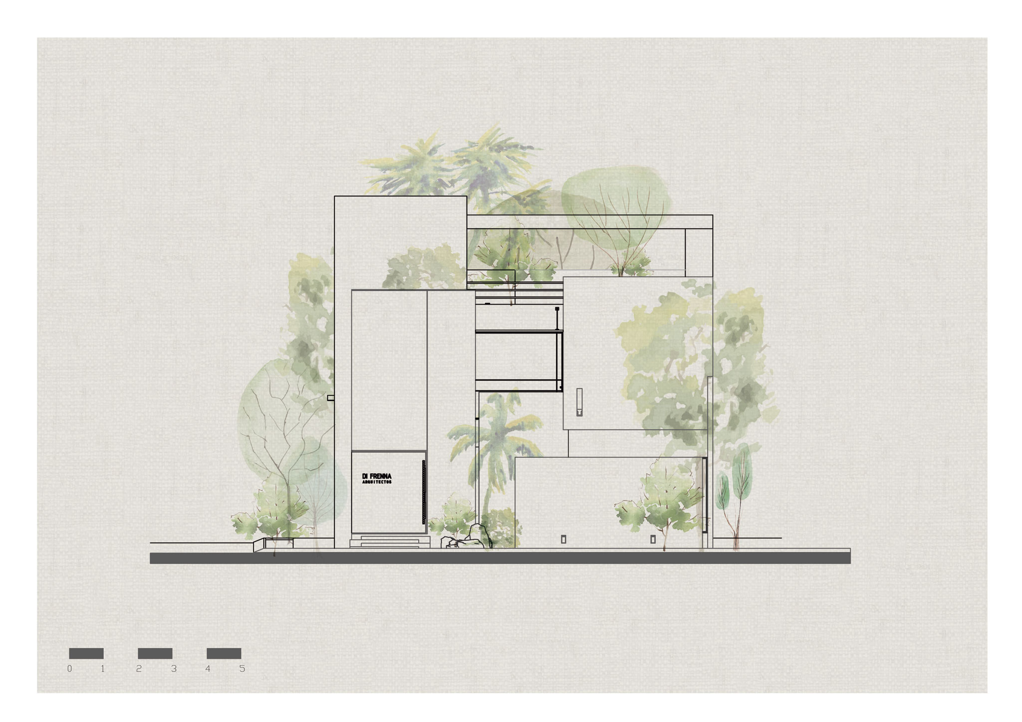 Taller Di Frenna Arquitectos se articula mediante una serie de patios interiores a los que se abren las diferentes estancias del estudio, facilitando un diálogo directo con la naturaleza, el agua, el aire y la luz solar, que marcan el ritmo natural de los días, con un programa compuesto por espacios como el taller de maquetas, áreas audiovisuales, salas de juntas y área de trabajo (abierta completamente al patio más grande), un conjunto de espacios funcionales que caracterizan un estudio de arquitectura.
